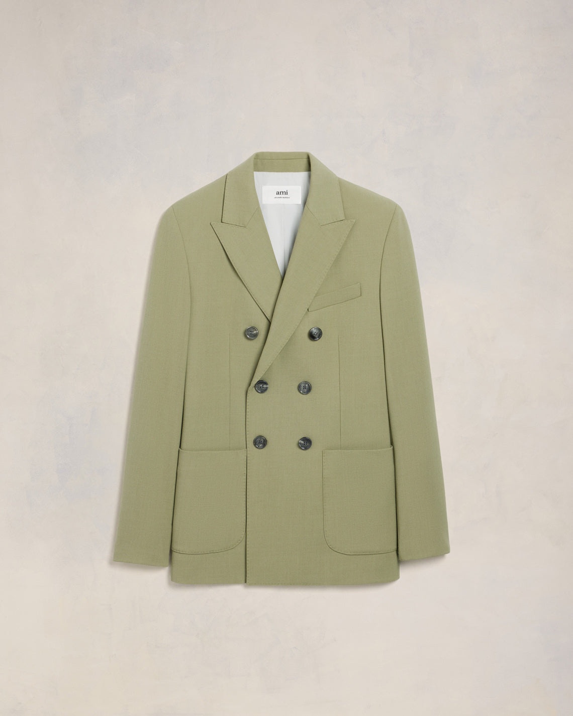 Double breasted jacket in wool and viscose twill. Adjusted fit 75 cm center back length (size 36) Fully lined Peak collar Inside pockets Chest welt pocket Patch pockets Buttoned cuffs Horn buttons Made in Romania (with love) REF : FBV207.VI0007.351 SIZE & FIT Fits true to size. Take your normal size. Model is 1m76 / 5'8" and is wearing a size 36. COMPOSITION & CARE GUIDE 55% Viscose, 45% New Wool Do not wash Chlorine prohibited Do not tumble dry Cool iron Dry clean petroleum solvent only on a gentle process