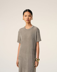 T-shirt dress in light shiny rib jersey. 155 cm center back length (size S) Gold engraved eyelets on the back Made in Portugal (with love) REF: FDR346.JE0110.0952 SIZE & FIT This item is designed to be worn lose. Take your normal size. Model is 1m81 / 5'11" and is wearing a size XS. COMPOSITION & CARE GUIDE 96% Polyethylene, 4% Elastane Chlorine prohibited Do not tumble dry Cool iron Do not dry clean Machine wash at 30°C gentle