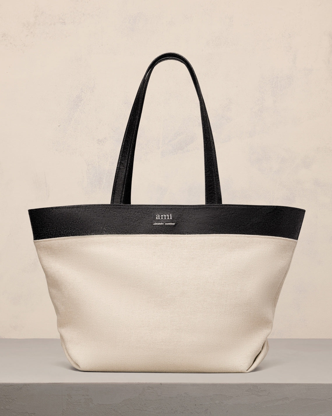 East West Shopping bag in linen canvas. Linen canvas lining ami alexandre mattiussi lettering in metal Inside zipped flying pocket Smooth leather handles, shoulder carry Metal hardware in vibrated silver color Size: 33x34x17 cm, length at the top 59 cm Made in Morocco (with love) REF : ULL506.AW0037.113 SIZE & FIT One size. COMPOSITION & CARE GUIDE 80% Linen, 20% Cotton Clean with a cloth or brush.