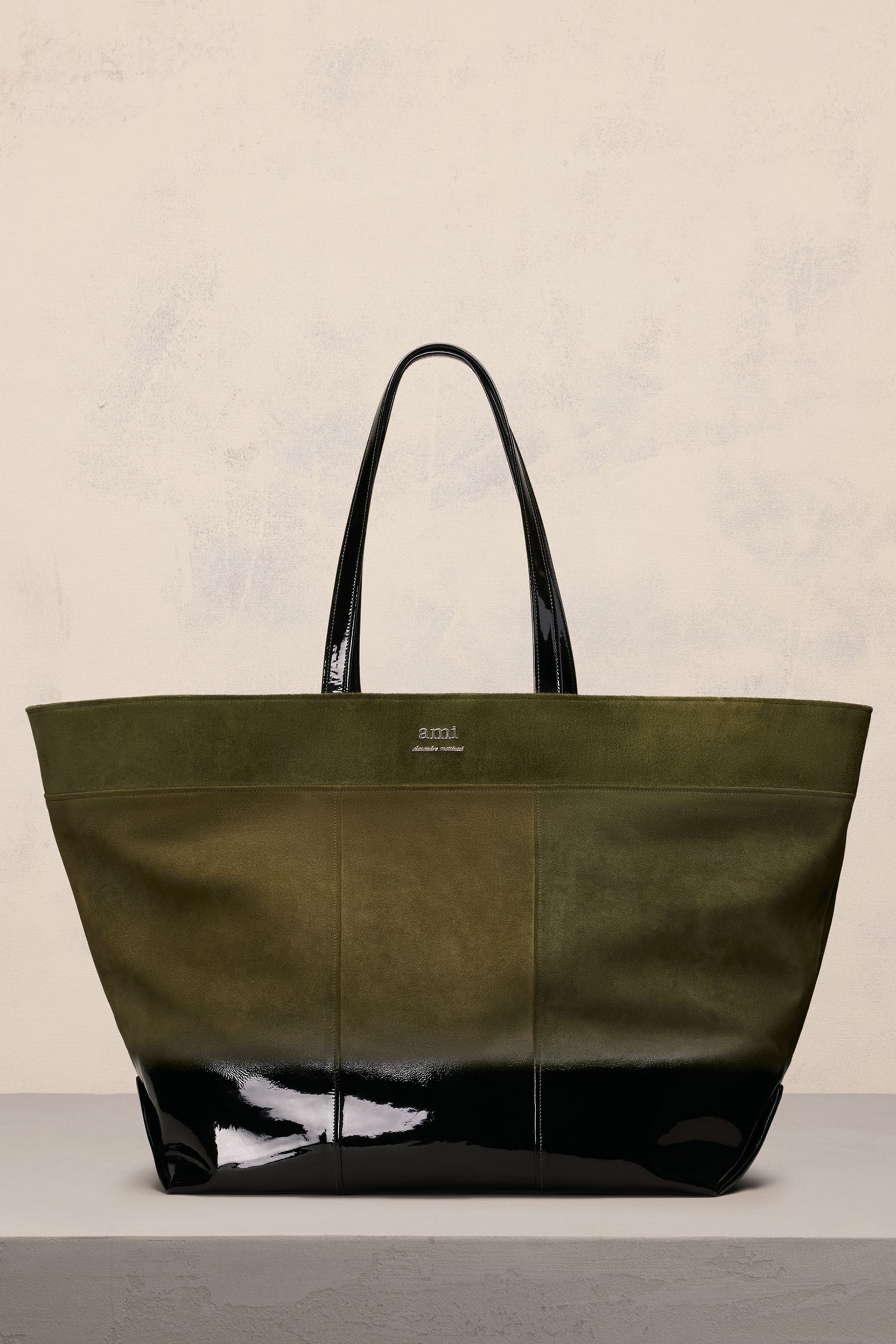 Product Description olive green canvas/leather/linen panelled design silver-tone logo plaque two long top handles internal zip-fastening pocket Maxi East West Shopping bag in gradient patent and suede leather. - Linen canvas lining - ami alexandre mattiussi lettering in metal - Inside zipped flying pocket - Patent leather handles, shoulder carry - Metal hardware in vibrated silver color - Size: 45x45x22.5 cm, length at the top 78 cm - Made in Morocco (with love) REF ULL505.AL0060364 Size & Fit One size. Materials & Care Instructions 100% Calfskin Clean with a cloth or brush