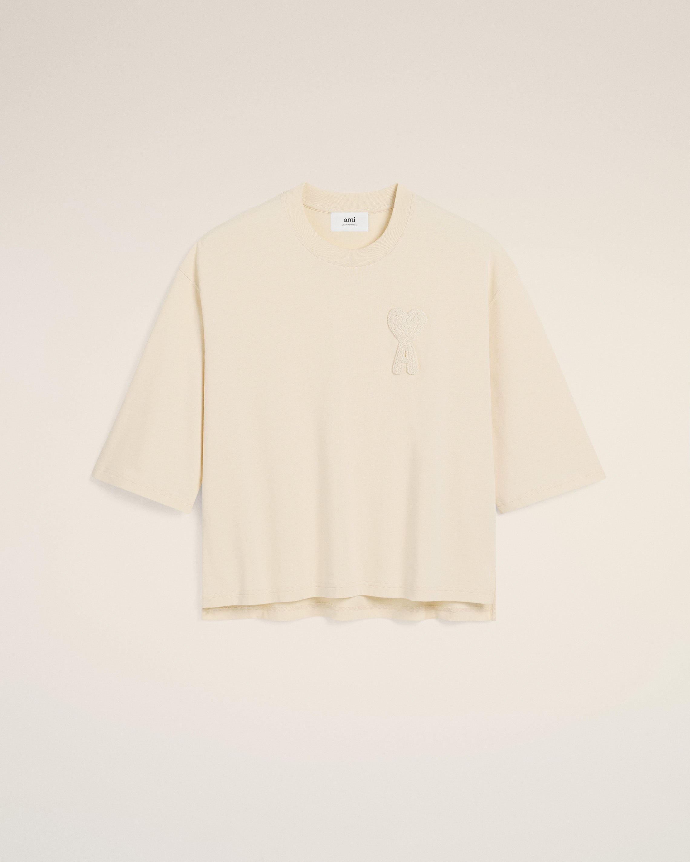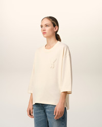 Ami de Coeur t-shirt in organic cotton jersey. Loose fit Three-quarter sleeves 65 cm center back length (size S) Tonal Ami de Coeur knitted patch Tonal "AMI" embroidery under back neckline Made in Portugal (with love) REF: FTS055.726.136 SIZE & FIT This item is designed to be worn lose. Take your normal size. Model is 1m80 / 5'11" and is wearing a size XS. COMPOSITION & CARE GUIDE 100% Organic Cotton Chlorine prohibited Machine wash at 30°C gentle Do not tumble dry Do not dry clean Cool iron