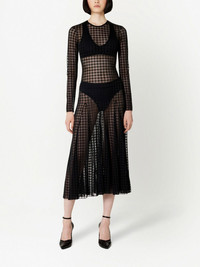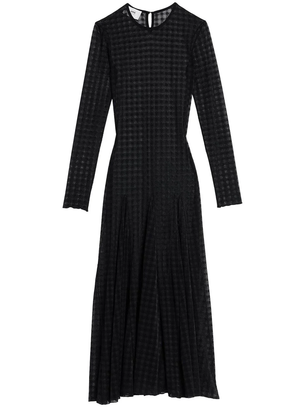 Product Description checked semi-sheer midi dress from AMI Paris featuring black, stretch-design, check pattern, crew neck, long sleeves, rear button fastening, keyhole detail to the rear, pleated skirt and mid-length. Long dress with godets in gingham pattern lace. - 128 cm middle back length (size S) - Covered button at the back - Made in Portugal (with love) REF FDR208.PA0006001 Size & Fit Fits true to size. Take your normal size. Materials & Care Instructions 94% Polyamide, 6% Elastane. Do not wash Do not bleach Do not tumble dry Cool iron Dry clean petroleum solvent only on a gentle process
