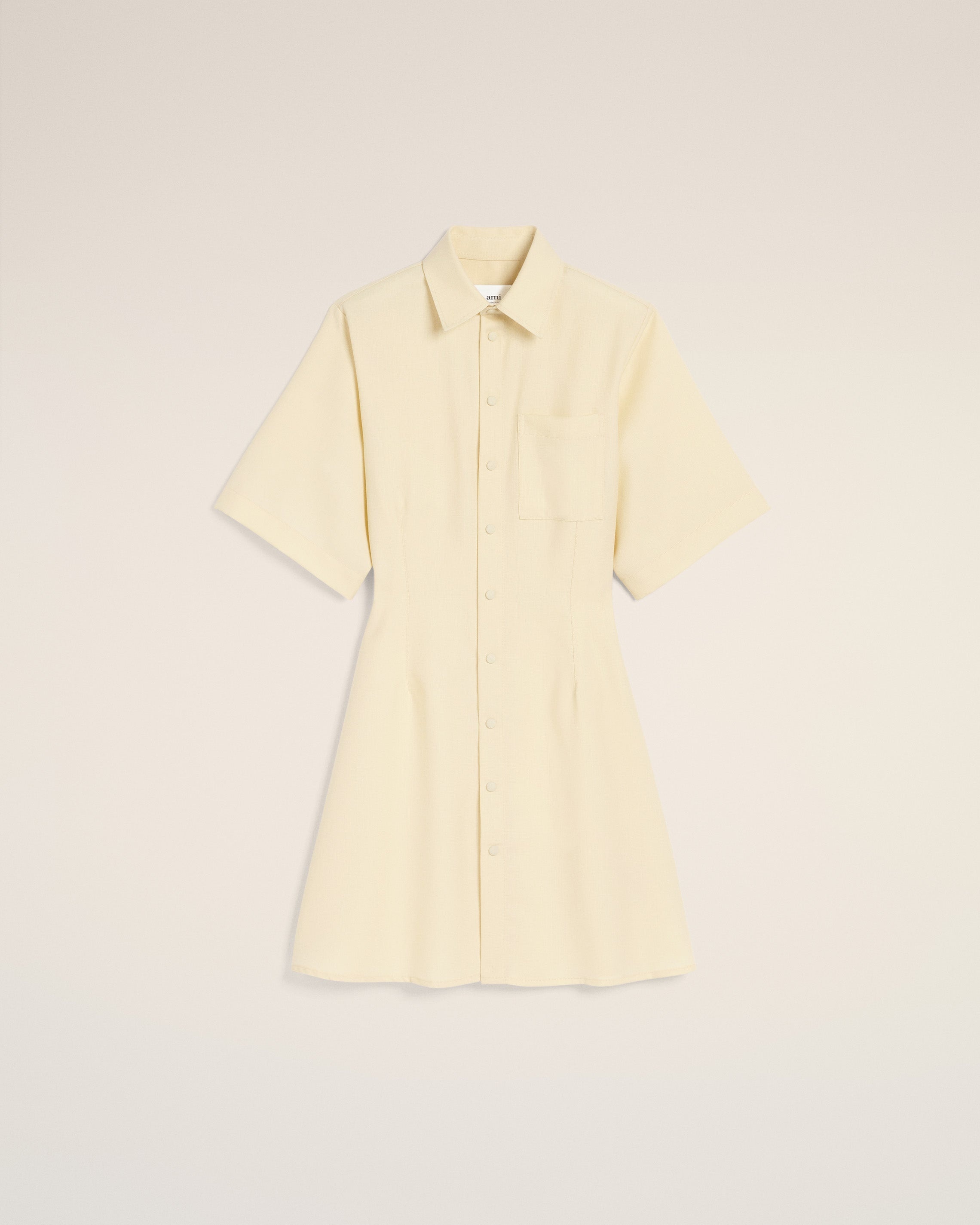 Short sleeve shirt dress in fluid wool canvas. Fitted fit 89 cm center back length (size 36) Classic collar Mini Ami de Coeur engraved metal plate under collar Covered snap buttons in fluid wool canvas Made in Poland (with love) SIZE & FIT This item is designed for a close fit. Take the next size up for a semi-fitted cut. COMPOSITION & CARE GUIDE 100% New Wool Do not wash Chlorine prohibited Do not tumble dry Cool iron Dry clean gentle