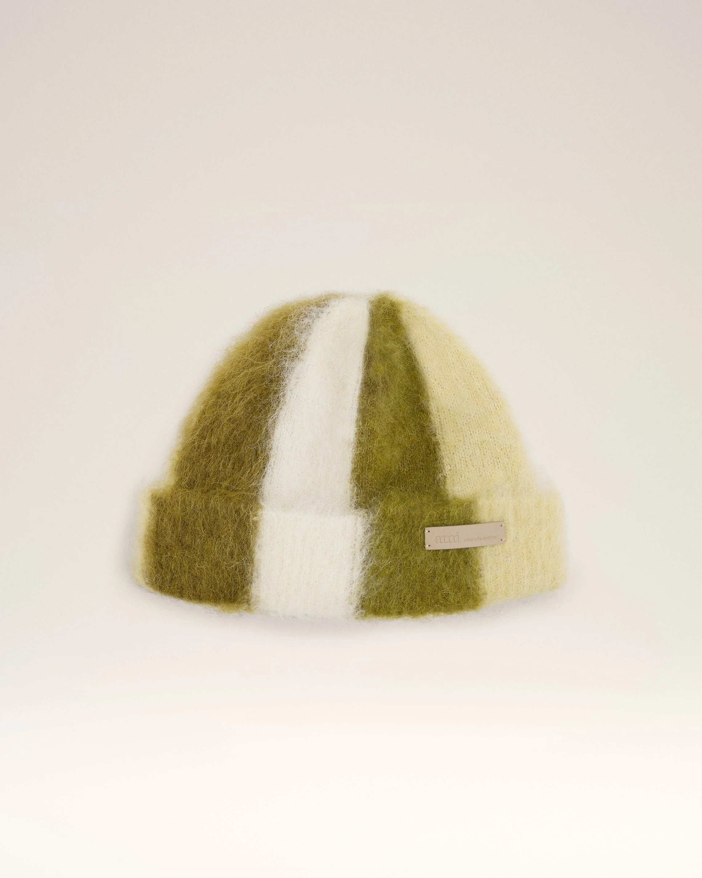 Striped hat in alpaca, mohair, wool and polyamide blend. Unisex product Striped pattern Leather label "ami alexandre mattiussi" Jersey stitch Made in Italy (with love) REF: UBO002.AK0008.1874 SIZE & FIT One size. COMPOSITION & CARE GUIDE Main Material : 28% Alpaca 28% Mohair 24% New Wool 20% Polyamide Do not wash Chlorine prohibited Do not tumble dry Cool iron Dry clean petroleum solvent only on a gentle process Contains non-textile parts of animal origin