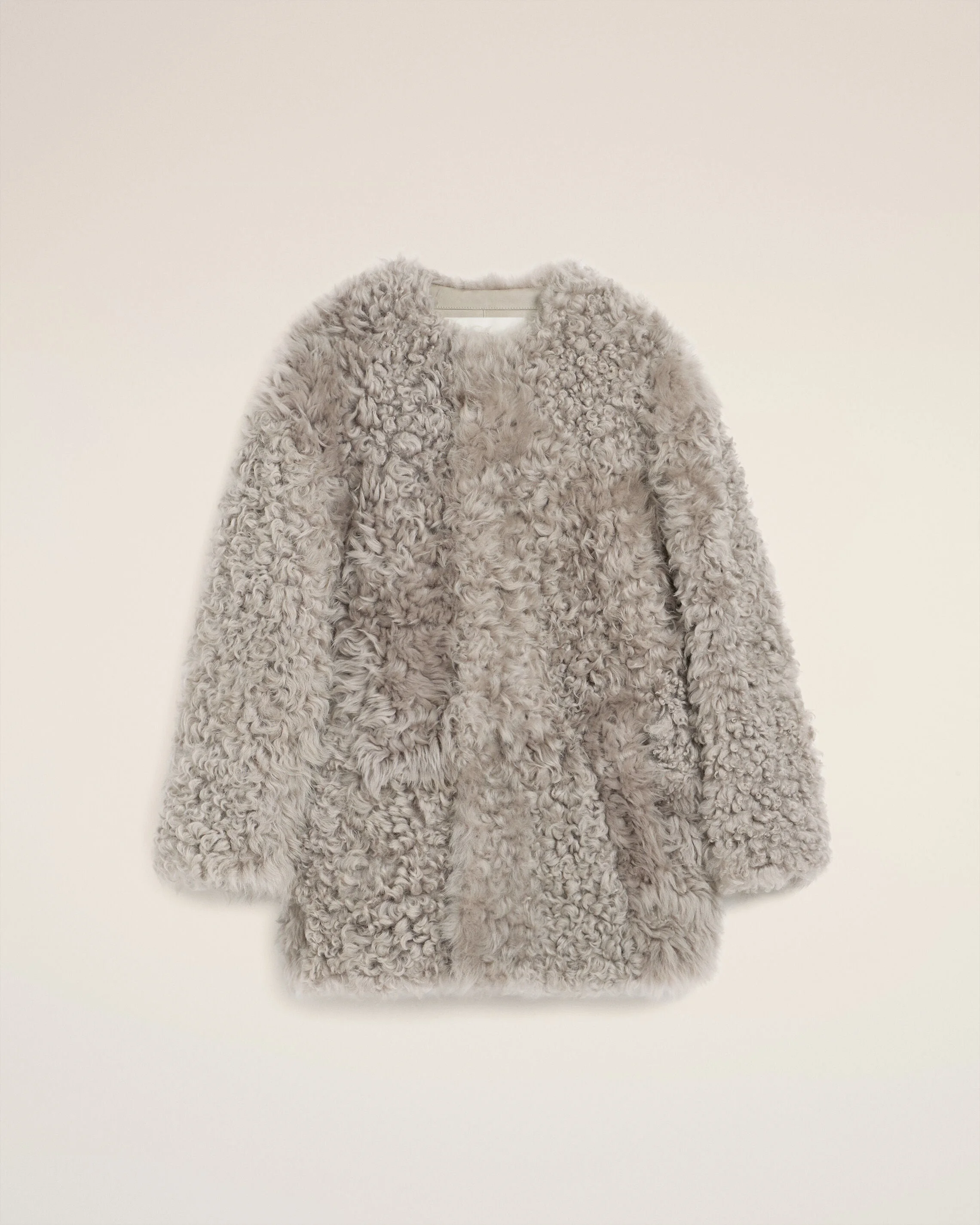 Coat in curly hair lamb shearling. Metal press buttons Unlined 80 cm middle back length (size S) Made in Turkiye (with love) REF: FCO470.LH0061.050 SIZE & FIT Fits true to size. Take your normal size. Model is 179 cm / 5"10 and is wearing a size S. COMPOSITION & CARE GUIDE Main Material : 100% Lamb Leather Pocket Lining : 100% Cotton Do not wash Chlorine prohibited Do not tumble dry Do not iron Do not dry clean Dry clean by a leather specialist
