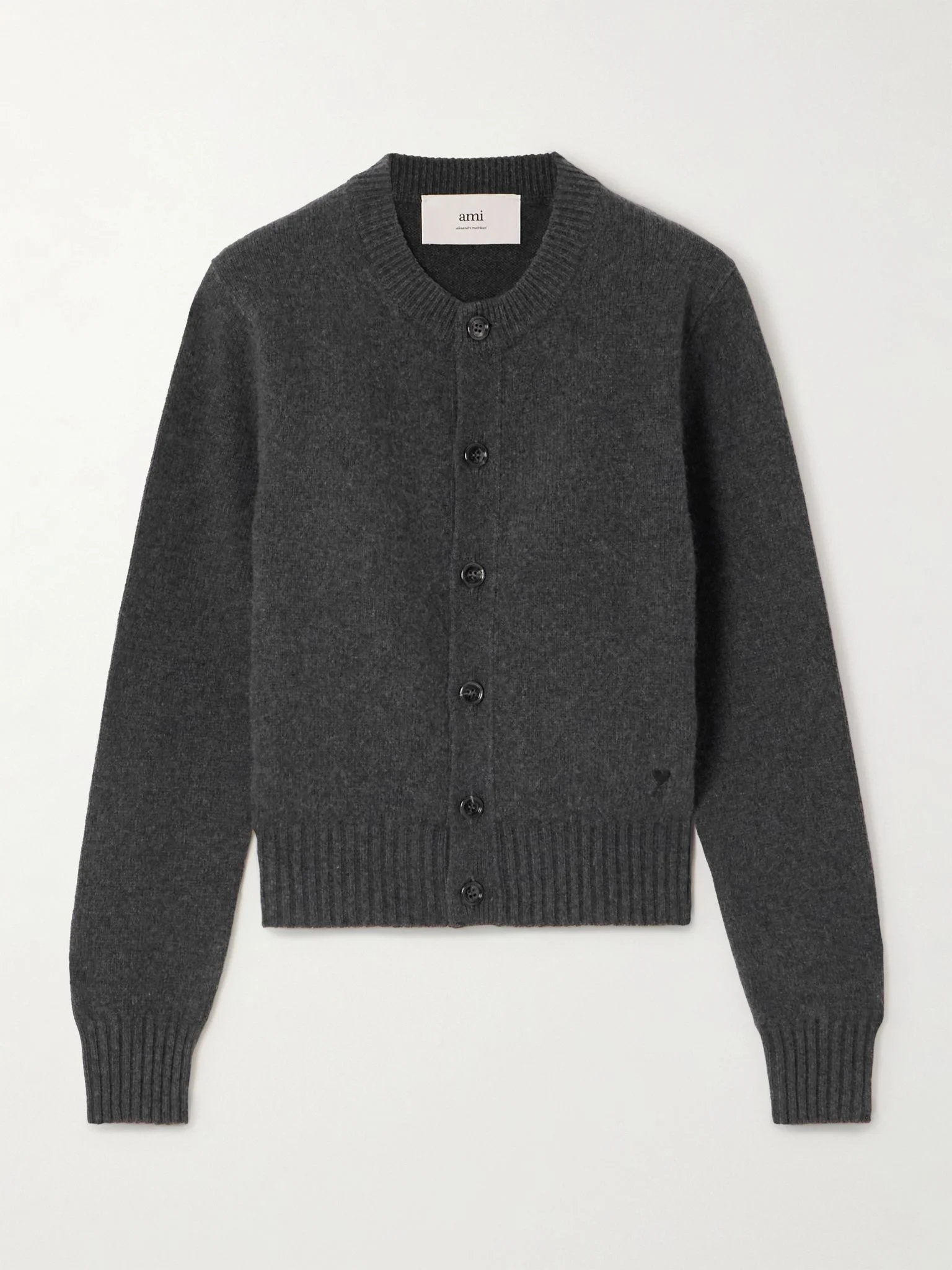 Exceptional knitwear is among AMI PARIS’ many strengths. This cardigan has been made in Italy from a blend of cashmere and wool that's supremely soft. It has a classic crew neck and signature 'Ami de Coeur' logo embroidered just above the ribbed hem. Size & Fit - Fits true to size, take your normal size - Designed for a loose fit - Lightweight knit - Model is 177cm/ 5'10" and is wearing a size Small Model measurements: - Bust: 80cm/ 31.5" - Waist: 60cm/ 23.6" - Hip: 80cm/ 31.5" Details & Care - Anthracite cashmere and wool-blend - Button fastenings through front - 97% cashmere, 3% wool - Hand wash