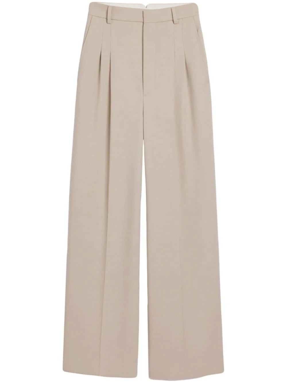 wide-leg tailored wool trousers Highlights - Light beige - Virgin wool - Wide leg - Tailored design - High-rise - Belt loops - Concealed front button, hook and zip fastening - Pleat detailing - Slip pockets to the sides - Two rear button-fastening jetted pockets - Extra-long length Imported Composition Virgin Wool 100% Washing instructions Read Manufacturer Guidelines