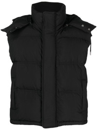 hooded padded gilet Conceived as a 'brand for friends', AMI Paris offers stylish clothes, blurring the boundaries between casual and chic. This down gilet is made of technical canvas and has a simple, straight design with a monochromatic colour scheme. The subtle tonal felted patch on the back adds a touch of sophistication to the overall look. Highlights - Black - Wool blend - Down-feather filling - Water-repellent finish - Applique logo - Drawstring hood - High neck - Concealed front fastening - Sleeveless - Two side welt pockets - Straight hem - When buying this unisex item, keep in mind that it is graded in standard men's sizing. Imported Composition Outer: Polyamide 100%, Wool 45%, Acrylic 45% Lining: Feather Down 100%, Polyester 100% SIZE & FIT FittingInformation Designed for a relaxed fit, this piece allows for comfort and movement when worn The internal drawstring at the hem allows for fitted preferences Made from a padded stretch fabric, giving it elasticity and a flexible fit This piece fits true to size – take your usual size