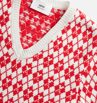 Product Description Ami de Coeur argyle jumper from AMI Paris featuring red, white, merino wool blend, signature Ami de Coeur monogram motif, argyle intarsia knit, V-neck, long sleeves, cropped and ribbed edge. Sweater in wool and polyamide jacquard. - V-neck - Jacquard stitch with Ami de Cœur logo - 45cm middle back length (size S) REF FKS230.030154 Size & Fit Fits true to size. Take your normal size. Materials & Care Instructions Hand wash low temperature Do not bleach Do not tumble dry Dry flat Cool iron Do not dry clean