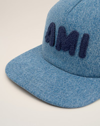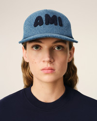 Trucker cap in used indigo denim. "Ami Paris" knitted patch Cotton lining "Ami Paris" signature eyelets "Ami" signature adjustment buckle Adjustable strap One size only, 57 cm, adjustable at the back Made in Bulgaria (with love) REF: UCP028.DE0046.480 SIZE & FIT One size. Adjustable at the back. COMPOSITION & CARE GUIDE 100% Cotton Do not wash Chlorine prohibited Do not tumble dry Do not iron Do not dry clean
