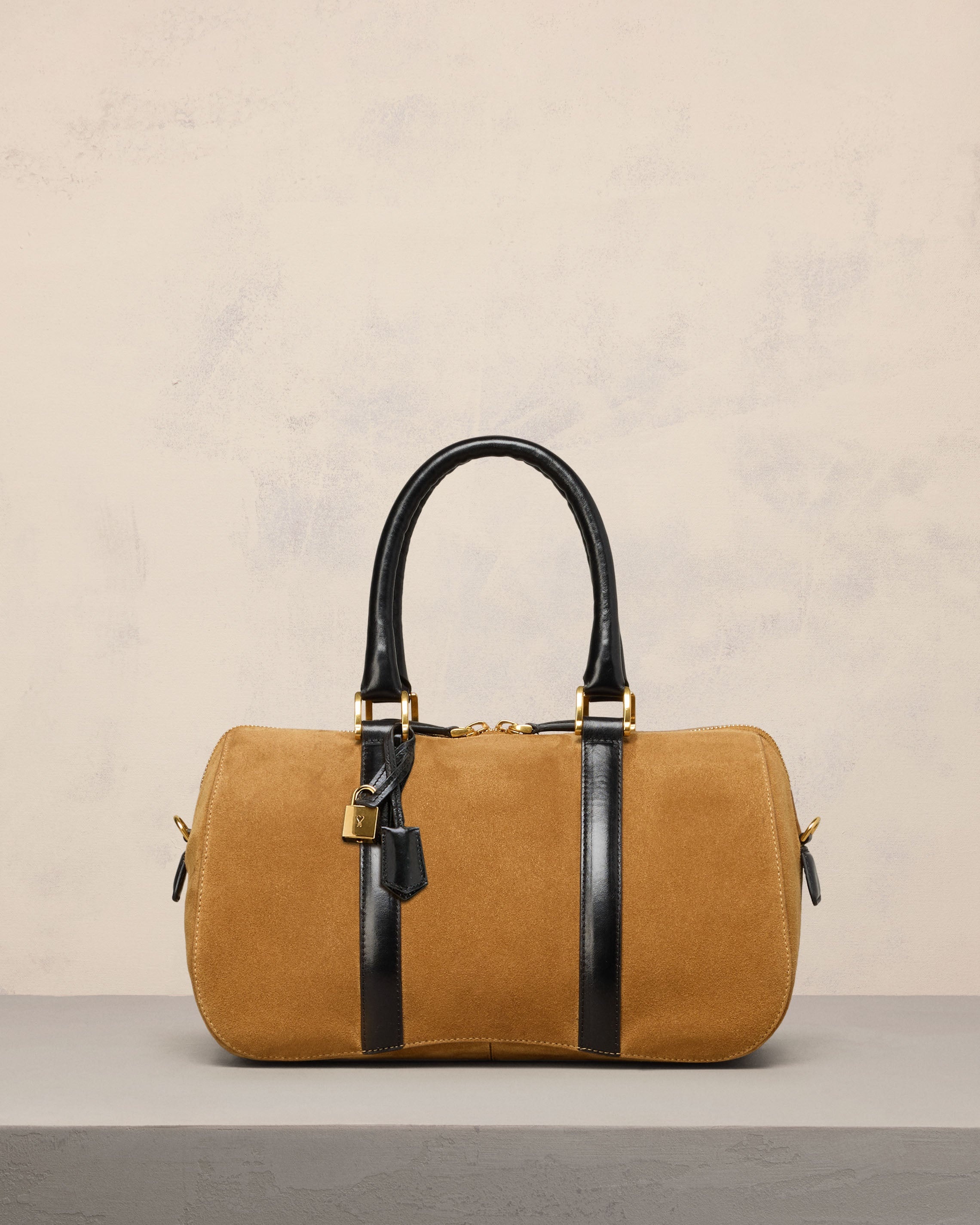 Boston bag in suede leather and vegetable-tanned textured leather. Natural patina of leather Suede leather lining Ami de Coeur stud and padlock One central zipped compartment with inside, a zipped pocket and patched pocket Adjustable and removable leather strap, crossbody or hand carry Metal hardware in vibrated brass color Size: 30x18x14 cm Made in Spain (with love) REF : ULL013.AL0084.280 SIZE & FIT Size: 30x18x14 cm COMPOSITION & CARE GUIDE 100% Cow Leather Our leathergoods are made from delicate materials. To keep the original aspect of the leather as long as possible, please avoid contact with abrasive and oily substances. Make sure not to expose them at the direct light for too long and to wipe them with a soft and dry cloth when wet. To avoid deformations, insure to not overload them. Keep them in their dust bag and safe from humidity.
