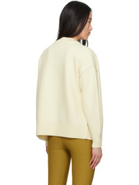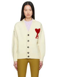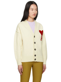 Felted knit virgin wool cardigan. Inverted seams throughout. · Rib-knit Y-neck, hem, and cuffs · Button closure · Intarsia logo at chest · Dropped shoulders Supplier color: Off white/Red 100% virgin wool. Made in Portugal 251482F095012
