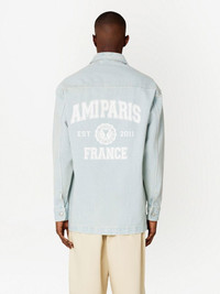 logo-print denim overshirt light blue cotton bleach wash crest motif logo print to the rear classic collar front button fastening front patch pocket long sleeves buttoned cuffs straight hem When buying this unisex item, keep in mind that it is graded in standard men's sizing. Imported Composition Cotton 100% Washing instructions Read Manufacturer Guidelines