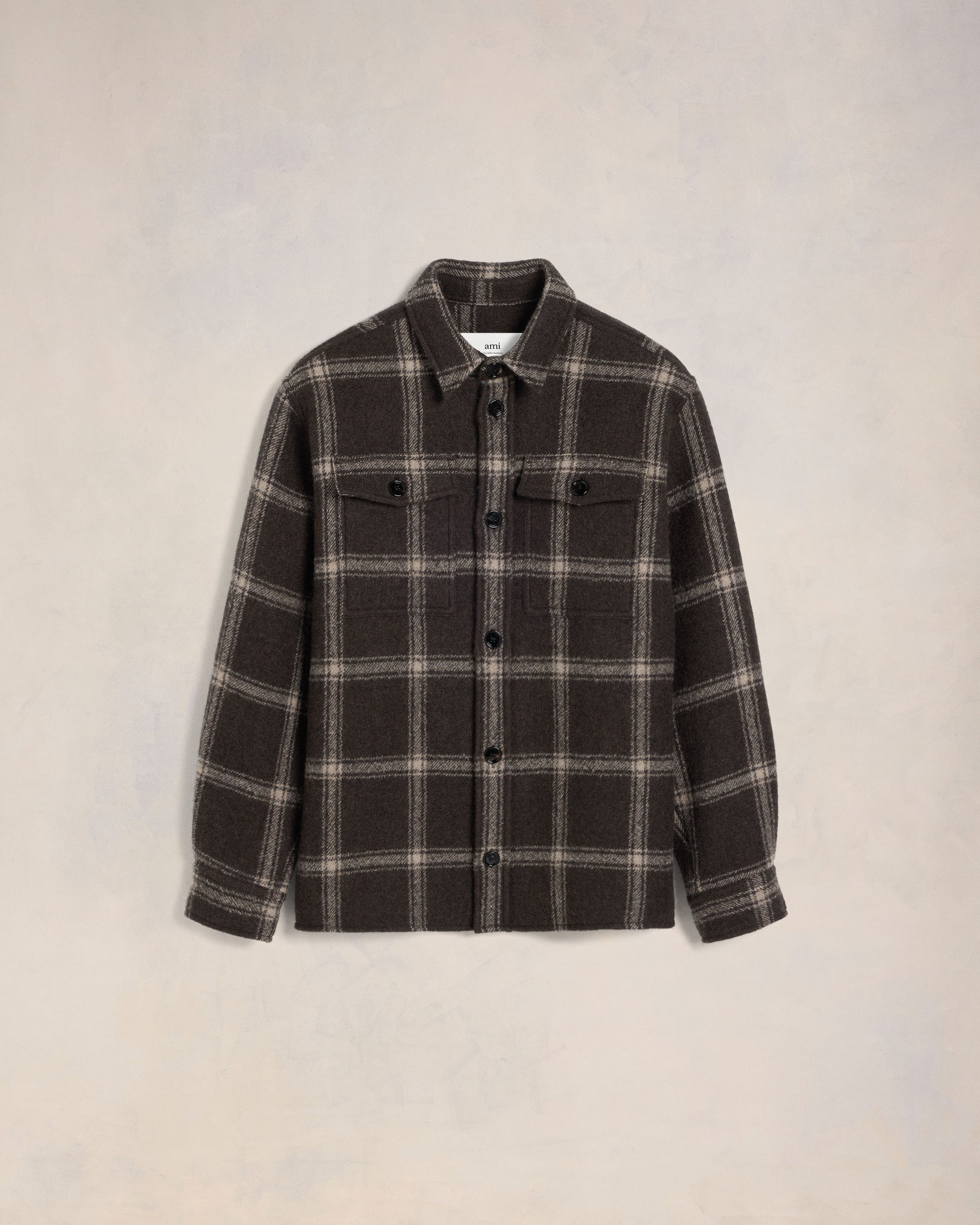 Overshirt in check wool. Unisex product 70 cm center back lenght (size XS) 72 cm center back lenght (size M) Unlined Buttoned tab on front and cuffs Chest pockets with flaps Horn buttons Embossed leather patch “ami alexandre mattiussi” under the collar on the back Made in Tunisia (with love) REF : UJK244.WO0001.2007 SIZE & FIT This style is unisex. For man, take your normal size. For woman, take one size down than your usual size. Man model is 1m83 / 6'0" and is wearing a size M. Woman model is 1m78 / 5'10" and is wearing a size XS. COMPOSITION & CARE GUIDE 80% Wool, 20% Polyamide Do not wash Chlorine prohibited Do not tumble dry Dry clean gentle Cool iron