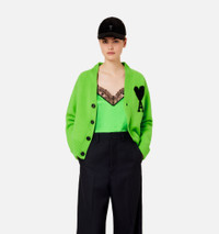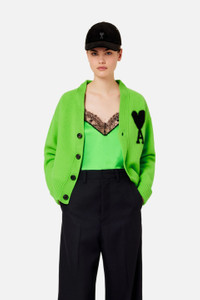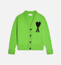 Product Description Ami de Coeur wool cardigan from AMI Paris featuring green, black, virgin wool, signature Ami de Coeur monogram motif, V-neck, front button fastening and long sleeves.