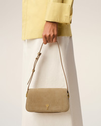 Shoulder Paris Paris bag in suede leather and smooth leather. Unisex product Shoulder carry Magnetic flap closure Metal hardware in vibrated brass color One main compartment with one front compartment and one patched pocket Ami de Coeur stud Suede lining Strap in smooth leather Adjustable leather strap, shortest drop of 21.5 cm, longest drop of 28.5 cm Size: 21x11x6 cm Made in Morocco (with love) REF: ULL719.AL0166.A086 SIZE & FIT Dimensions : 21x11x6 cm COMPOSITION & CARE GUIDE Main Material : 100% Cow Leather Secondary Material : 100% Cow Leather Main Lining : 100% Lamb Leather Our leathergoods are made from delicate materials. To keep the original aspect of the leather as long as possible, please avoid contact with abrasive and oily substances. Make sure not to expose them at the direct light for too long and to wipe them with a soft and dry cloth when wet. To avoid deformations, insure to not overload them. Keep them in their dust bag and safe from humidity