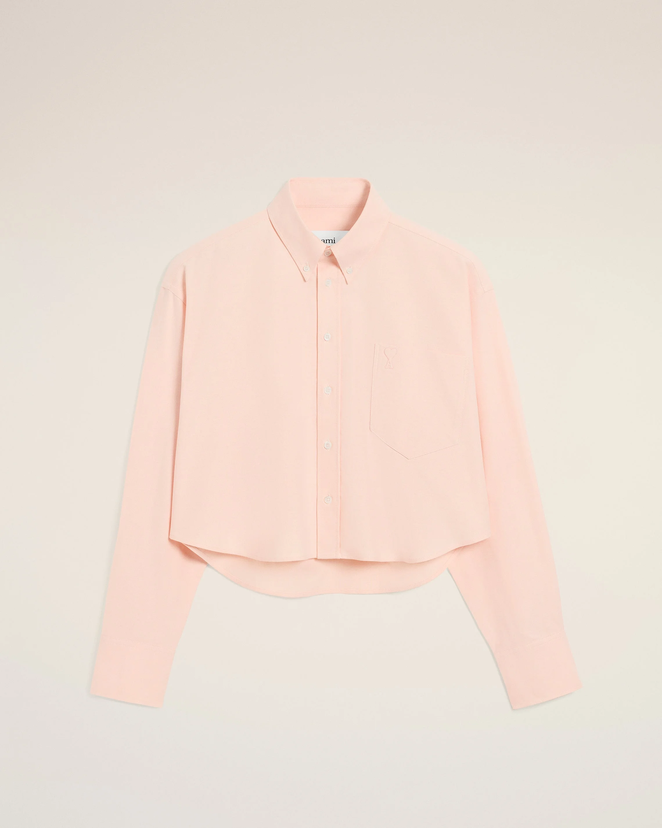 Button down cropped oversized shirt in cotton Oxford. Cropped oversized fit Button down collar Buttoned tab on frond and cuffs Mother of pearl buttons Patch pocket Embossed and topstitched Ami de Coeur on pocket 58 cm center back length (size 36) Made in Portugal (with love) REF: FSH770.CO0031.680 SIZE & FIT This item is designed to be worn lose. Take your normal size. Model is 181 cm / 5"11 and is wearing a size 36. COMPOSITION & CARE GUIDE Main Material : 100% Cotton Chlorine prohibited Do not tumble dry Dry clean gentle Cool iron Machine wash at 30°c gentle
