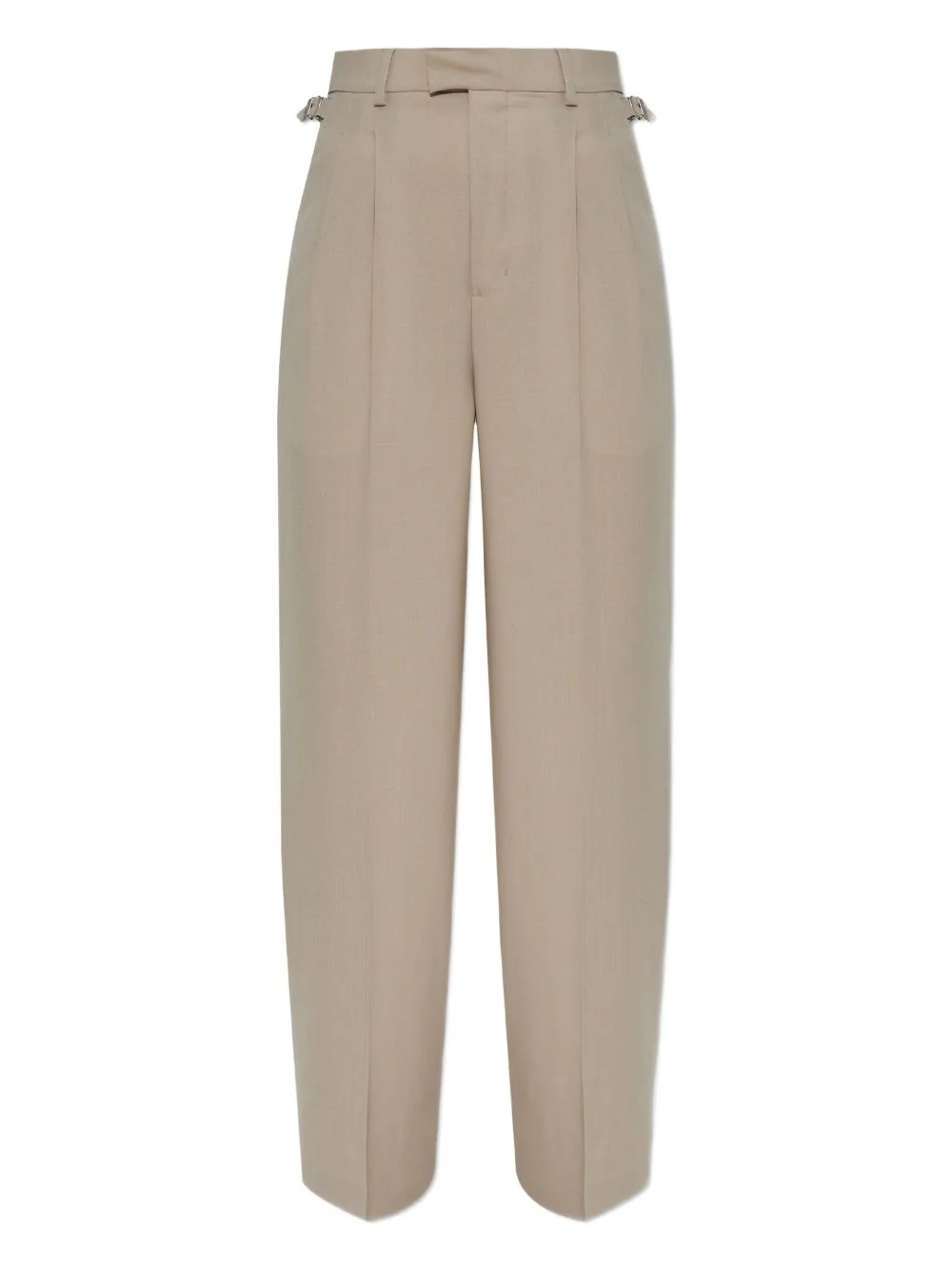pleated buckle-fastening trousers Highlights - Beige - Pleated design - High waist - Wide leg - Buckle fastening - Straight hem Imported Composition Virgin Wool 100%