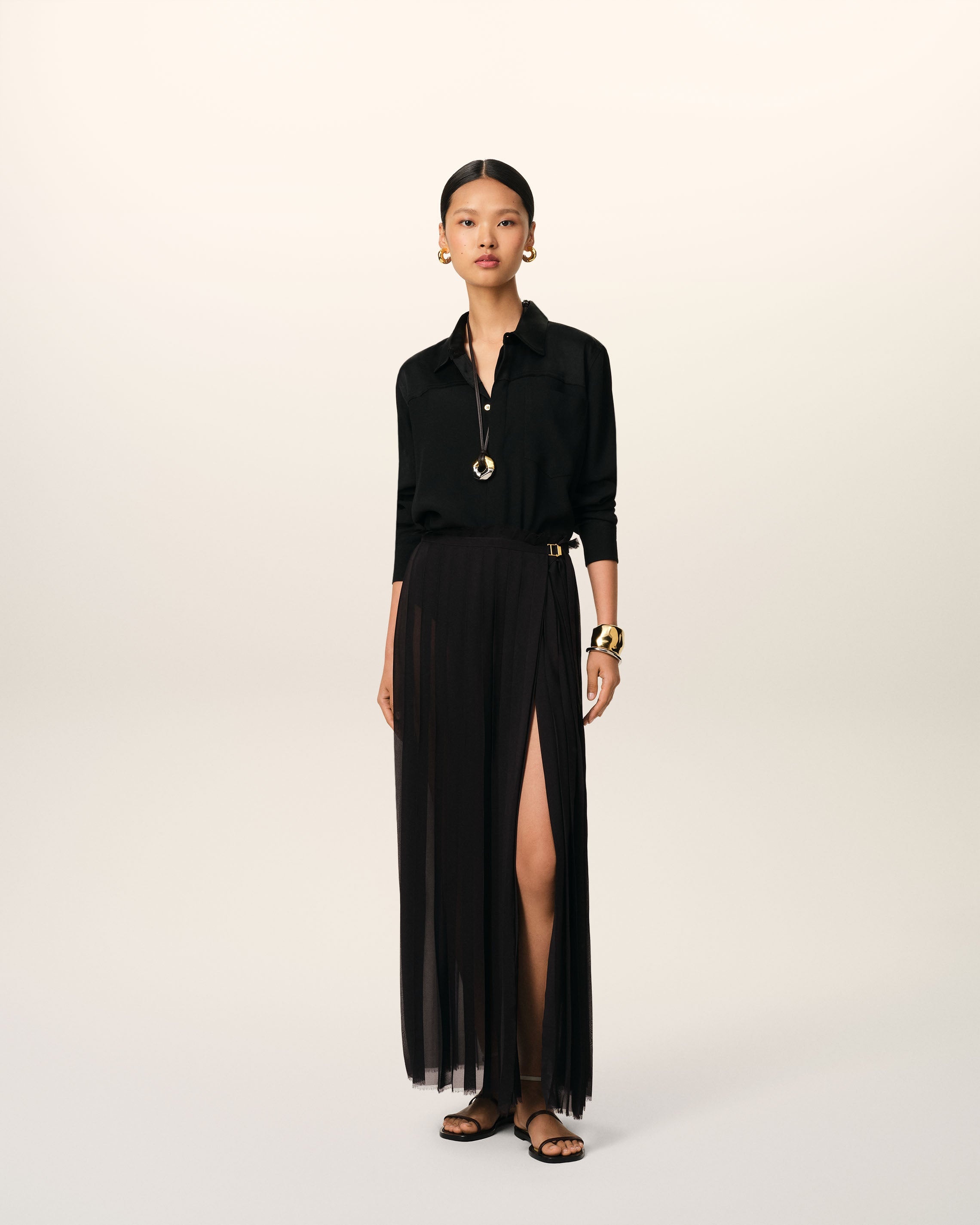 Long pleated skirt in polyester crepe. Length below waist 102 cm (size 36) Buckle at waist Can be worn low or regular waist thanks to adjustment buttons in waistband Removable lining Permanent pleats Made in Madagascar (with love) REF: FSK353.PL0027.001 SIZE & FIT Fits true to size. Take your normal size. Model is 1m81 / 5'11" and is wearing a size 36. COMPOSITION & CARE GUIDE 100% Polyester Do not wash Chlorine prohibited Do not tumble dry Cool iron Dry clean petroleum solvent only on a gentle process