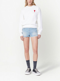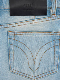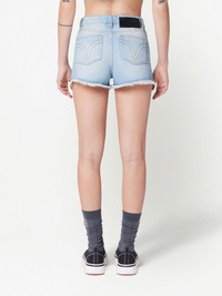 raw-cut mini shorts blue cotton washed denim contrast stitching logo-debossed patch to the rear classic five pockets front button and zip fastening belt loops raw-cut hem thigh-length Imported Composition Cotton 100%