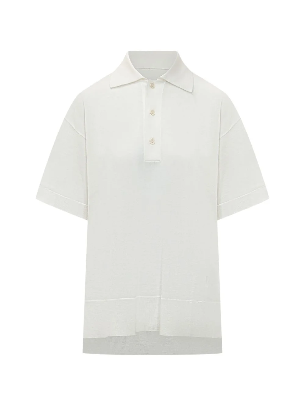 short-sleeve wool polo shirt Highlights - Beige - Wool - Short sleeve - Button fastening - Tonal logo - Ribbed details - Classic collar Imported Composition Wool 75%, Silk 25% Washing instructions Read Manufacturer Guidelines