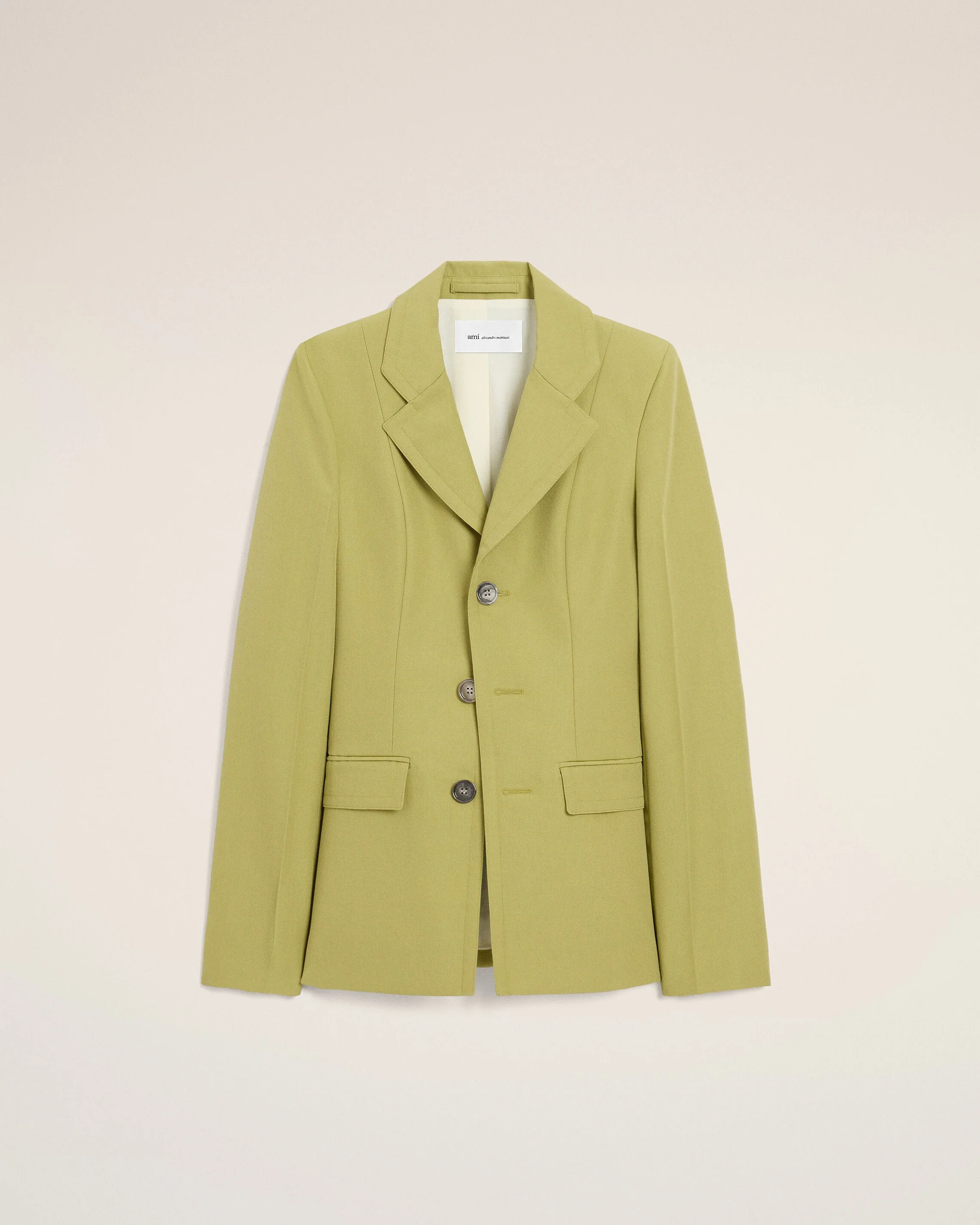 Simple breasted jacket in wool canvas. Fitted fit Single breasted 1 functionnal buttoned holes, 2 decorative ones Bottom sleeves buttoned Horn Ami buttons Flap pockets Slit middle back Fully lined "Ami Paris Heritage" label sewn inside the jacket Made in Romania (with love) REF: FBV762.WV0195.A035 SIZE & FIT This item is designed for a close fit. Take your normal size. Woman model is 179 cm / 5"8 and is wearing a size 36. COMPOSITION & CARE GUIDE Main Material : 100% New Wool Main Lining : 50% Polyester, 50% Cotton Sleeves Lining : 50% Polyester, 50% Cotton Sleeves Lining : 54% Acetate, 45% Viscose, 1% Polyester Pocket Lining : 65% Polyester, 35% Cotton Do Not Wash Chlorine Prohibited Do Not Tumble Dry Cool Iron Dry Clean Gentle