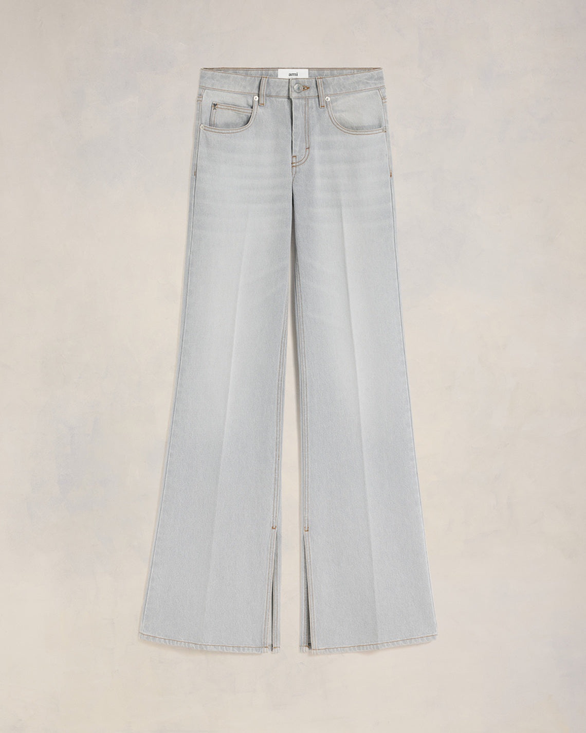 Slitted Flare fit jeans in javel grey denim. Flare fit 30 cm bottom leg width (size 26) Low waist Flare and slitted inside legs 5 pockets Zipped fly Denim metal rivets and buttons in nickel color Ami de Coeur rivet Beige ami patch in synthetic leather on the back Tobacco topstitches Made in Portugal (with love) REF : FTR425.DE0028.0555 SIZE & FIT Fits true to size. Take your normal size. Model is 1m78 / 5'10" and is wearing a size 36. COMPOSITION & CARE GUIDE 100% Cotton Machine wash at 30°C Chlorine prohibited Do not tumble dry Line dry in shade Medium iron Dry clean possible Wash and iron inside out