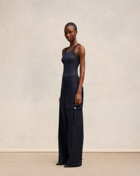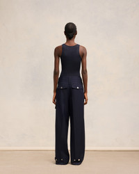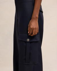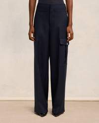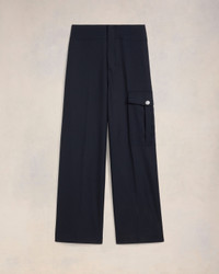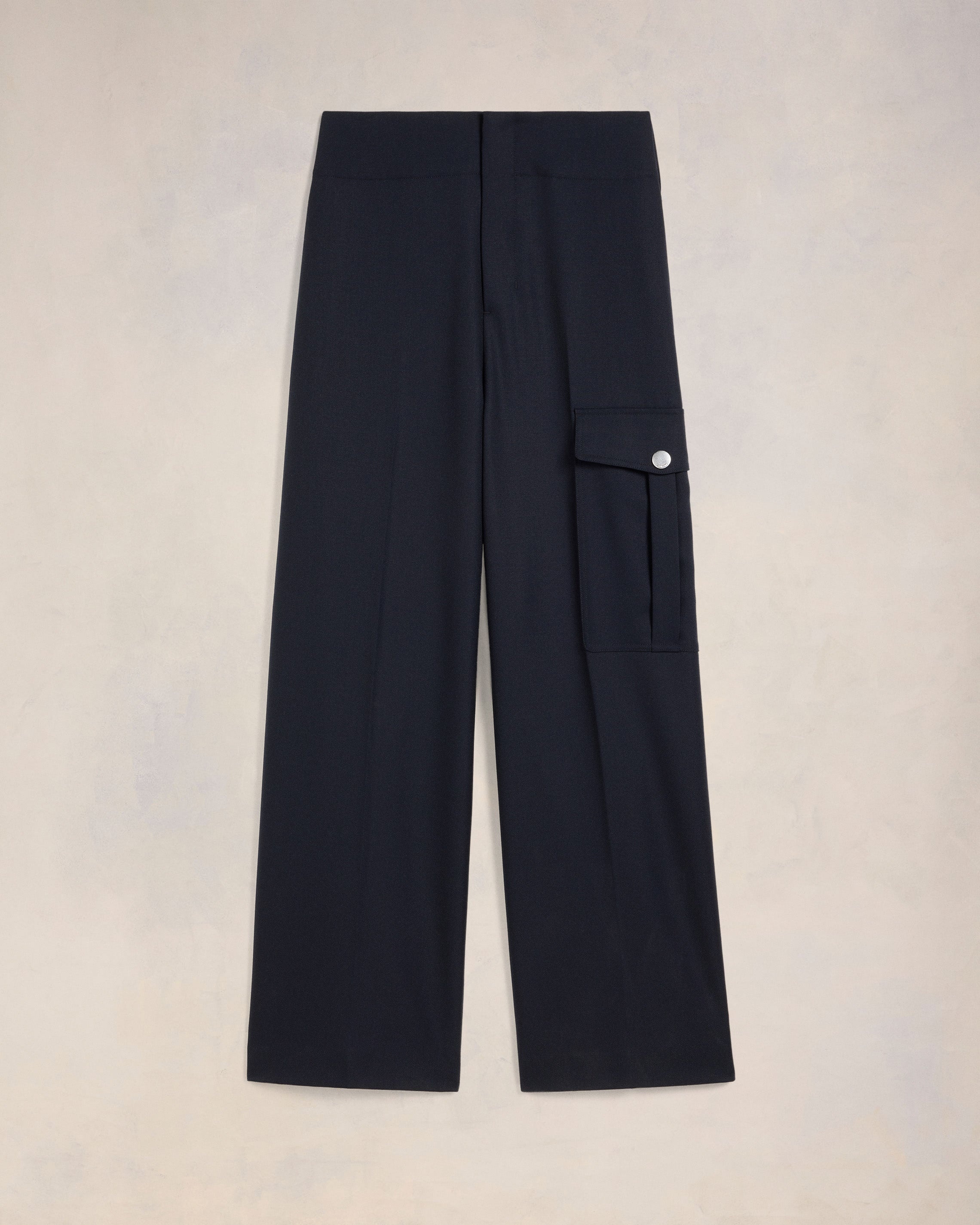 Large trousers in wool gabardine. Large fit High waist 30 cm bottom leg width (size 36) Front lining to knees Back flap pockets with metal snap buttons Flap pocket on side with metal snap button Buttoned fly Horn buttons Made in Romania (with love) REF : FTR513.WV0053.4011 SIZE & FIT This item is designed to be worn lose. Take your normal size. Model is 1m78 / 5'10" and is wearing a size 36. COMPOSITION & CARE GUIDE 100% New Wool Chlorine prohibited Do not tumble dry Dry clean gentle Cool iron Do not wash