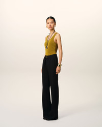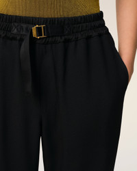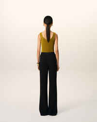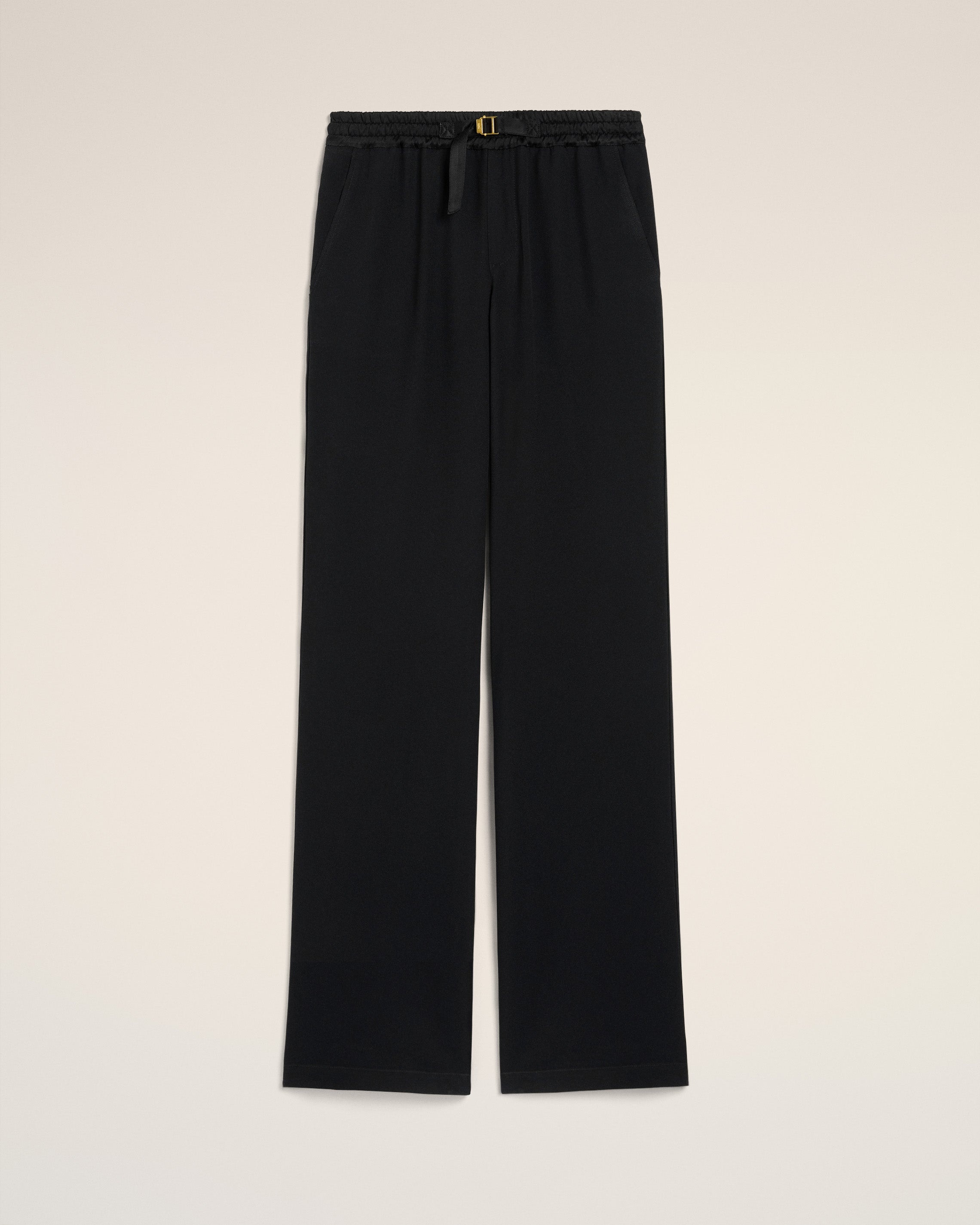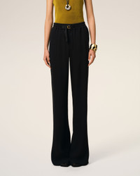 Flare fit elasticated trousers in viscose and acetate crepe. 29 cm bottom leg width (size S) Elasticated waist Flare leg Strap with buckle in gold color Fake fly without buttons Patch pockets on the back Mini Ami de Coeur plate on the back pocket Made in Bulgaria (with love) REF: FTR203.AC0014.001 SIZE & FIT Fits true to size. Take your normal size. Model is 1m81 / 5'11" and is wearing a size XS. COMPOSITION & CARE GUIDE 71% Acetate, 29% Viscose Do not wash Chlorine prohibited Do not tumble dry Cool iron Dry clean petroleum solvent only on a gentle process