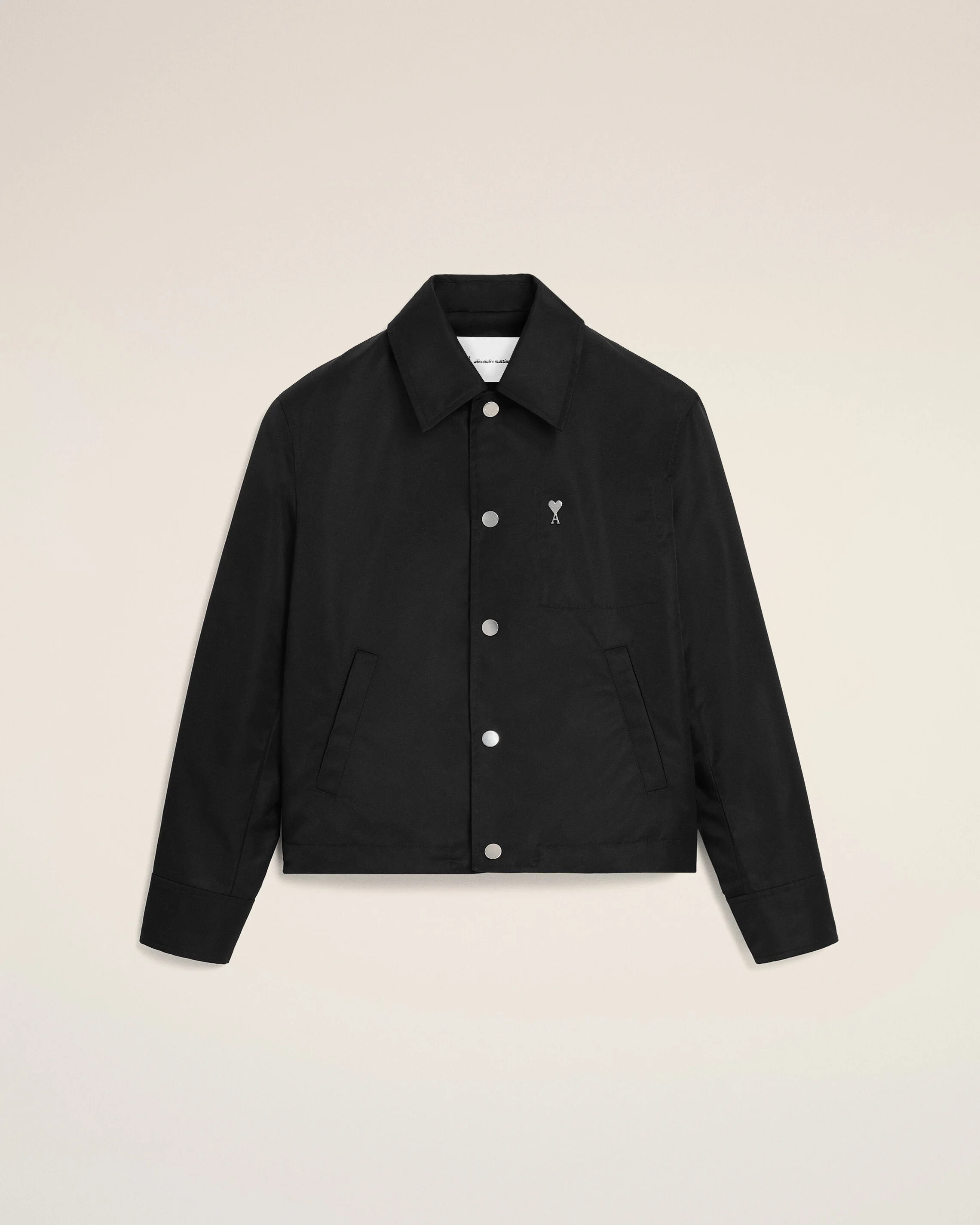 Buttoned jacket in technical nylon. Unisex product First snap button in nickel color on the collar with ami banding Front closing with snap buttons in nickel color Front welt pockets with invisible snap buttons Adjustable cord at waist with "ami paris" metal eyelets Tonal metal Ami de Coeur rivet on the chest Water repellent fabric Made in Romania (with love) REF: UJK872.PA0037.001 SIZE & FIT This style is unisex. For man, take your normal size. For woman, take one size down than your usual size. Woman model is 176 cm / 5"7 and is wearing a size XS. Man model is 188 cm / 6"1 and is wearing a size M. COMPOSITION & CARE GUIDE Main Material : 100% Polyamide Pocket Lining : 65% Polyester, 35% Cotton Do Not Wash Chlorine Prohibited Do Not Tumble Dry Cool Iron Dry Clean Gentle