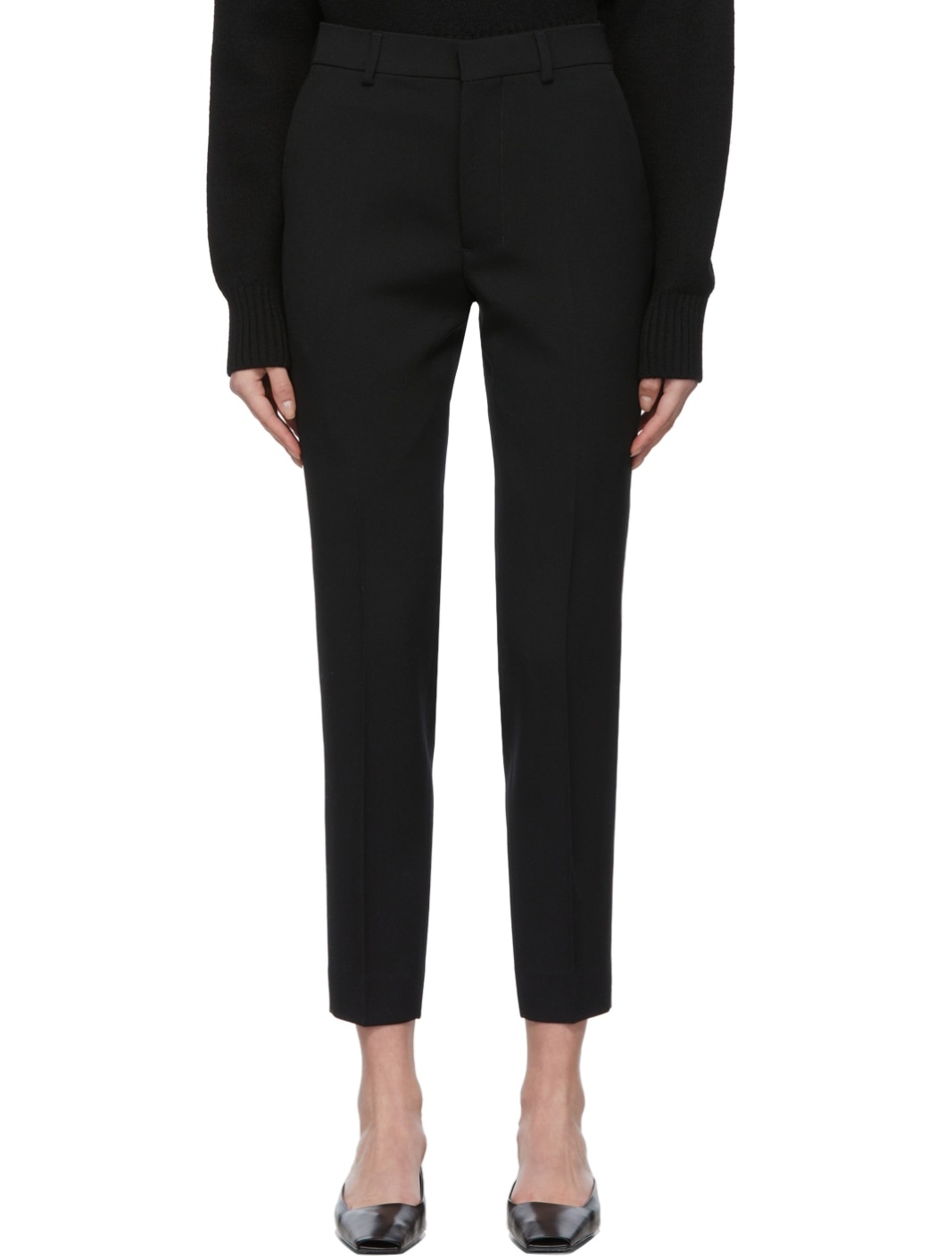 Tapered virgin wool twill trousers in black. · Mid-rise · Four-pocket styling · Zip-fly · Unlined Supplier color: Black Body: 100% virgin wool. Lining 1: 100% recycled polyester. Lining 2: 35% cotton, 35% recycled polyester, 30% polyester.