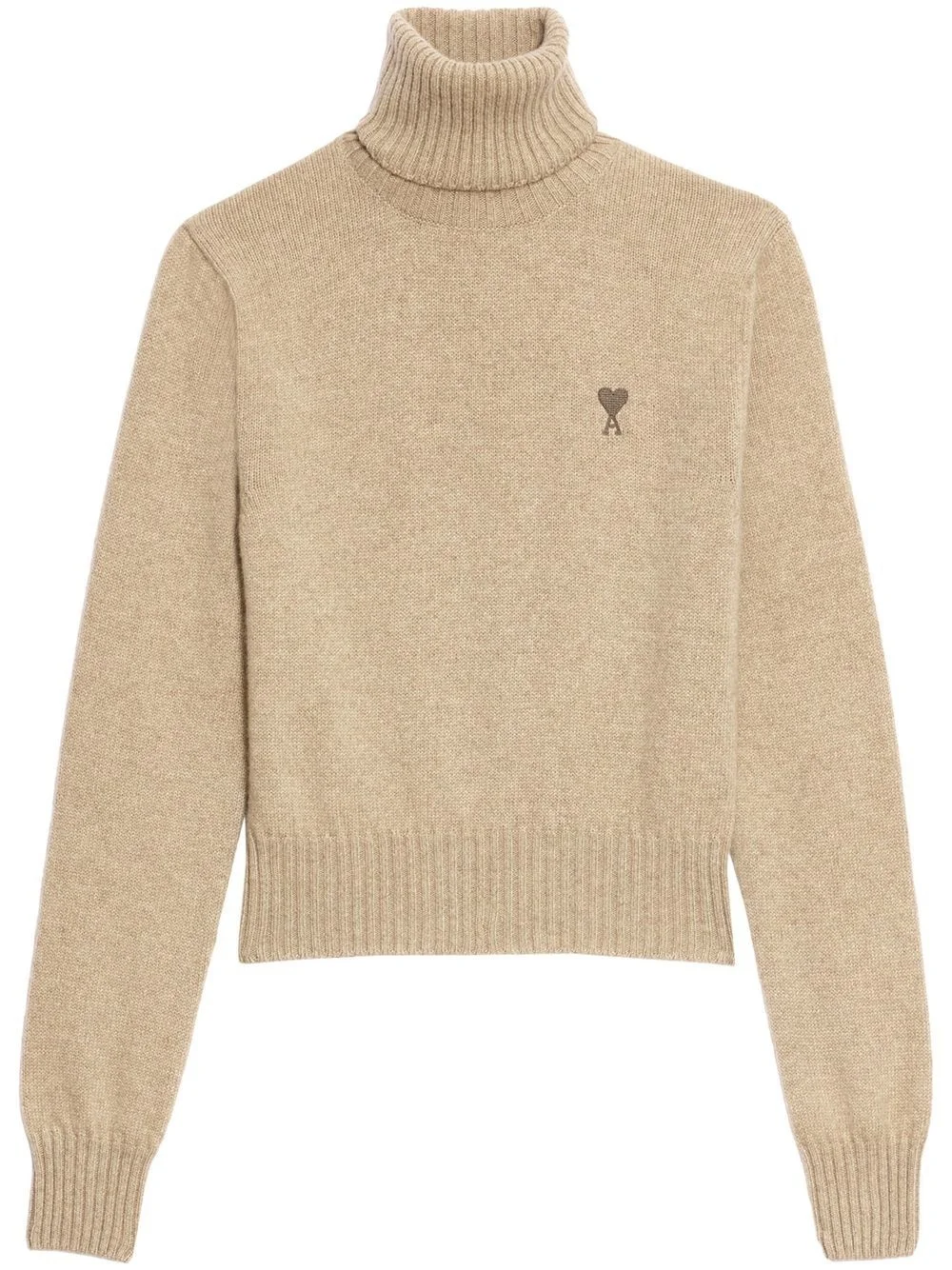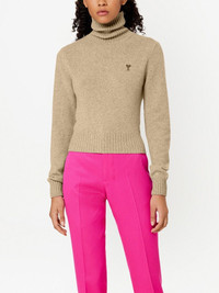 Product Description Ami De Coeur roll-neck jumper from AMI Paris featuring taupe brown, cashmere, signature Ami de Coeur monogram motif, embroidered logo at the chest, ribbed cuffs, long sleeves, ribbed trim and roll neck. Sweater in recycled cashmere. - Turtleneck - Jersey stitch - Tonal Ami de Coeur chest embroidery - 48cm middle back length (size S) REF FKS407.005250 Size & Fit Fits true to size. Take your normal size. Materials & Care Instructions Hand wash low temperature, Do not bleach, Do not tumble dry, Dry flat, Cool iron, Dry clean possible