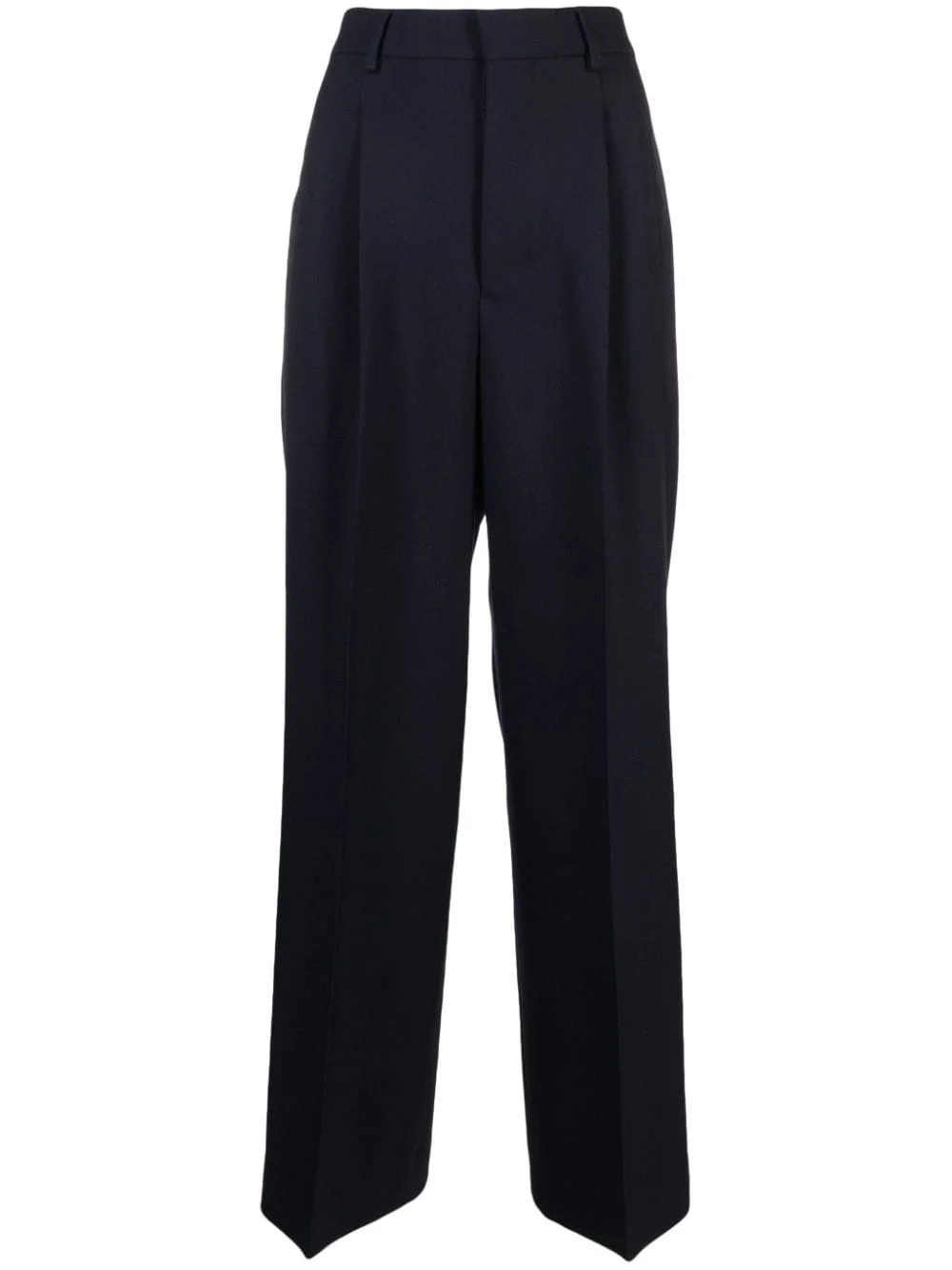 wide-leg tailored trousers AMI Paris presents its take on timeless tailoring in these wide-leg trousers, displayed in their refined pleat detailing and sophisticated midnight blue hue. Highlights - Midnight blue - Virgin wool - High-waisted - Belt loops - Concealed front fastening - Pleat detailing - Two rear button-fastening pockets - Wide leg Imported Composition Outer: Virgin Wool 100% Lining: Polyester 100%