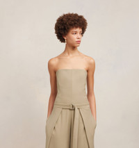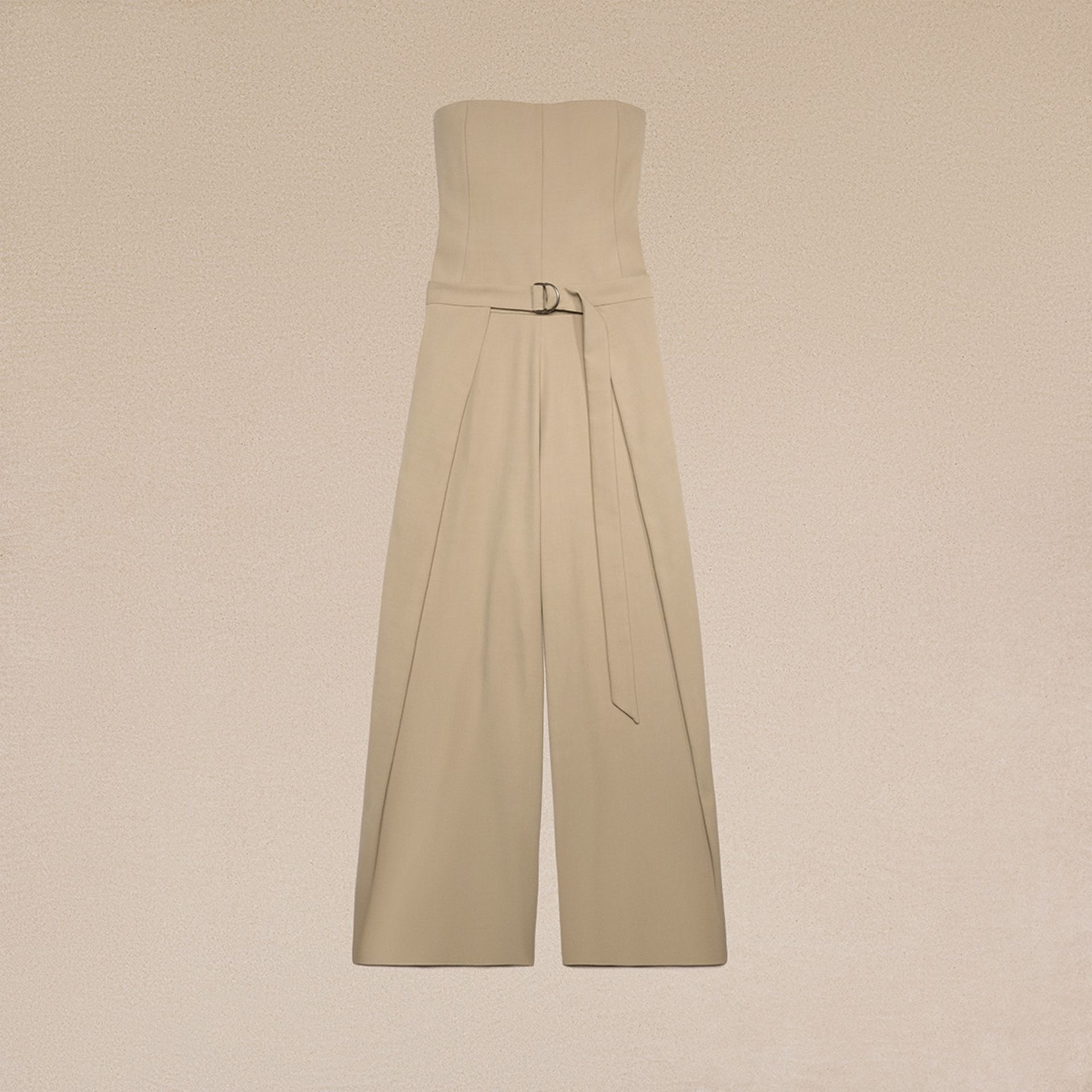 Product Description strapless layered jumpsuit from AMI Paris featuring beige, virgin wool blend, strapless, dart detailing, layered details, D-ring buckle belt and wide leg. Jumpsuit with floating panels in wool and viscose twill. - Strapless - 31 cm bottom leg width (size 36) - Front lining to the knees - Panels to tie at the waist - Middle back zip closure - Made in France (with love) REF FDR507.VI0007265 Size & Fit Fits true to size. Take your normal size. Model is 1m80 / 5'11" and is wearing a size 36. Materials & Care Instructions 55% Viscose, 45% New Wool Chlorine prohibited Do not tumble dry Dry clean gentle Cool iron Do not wash Find out more about product traceability.