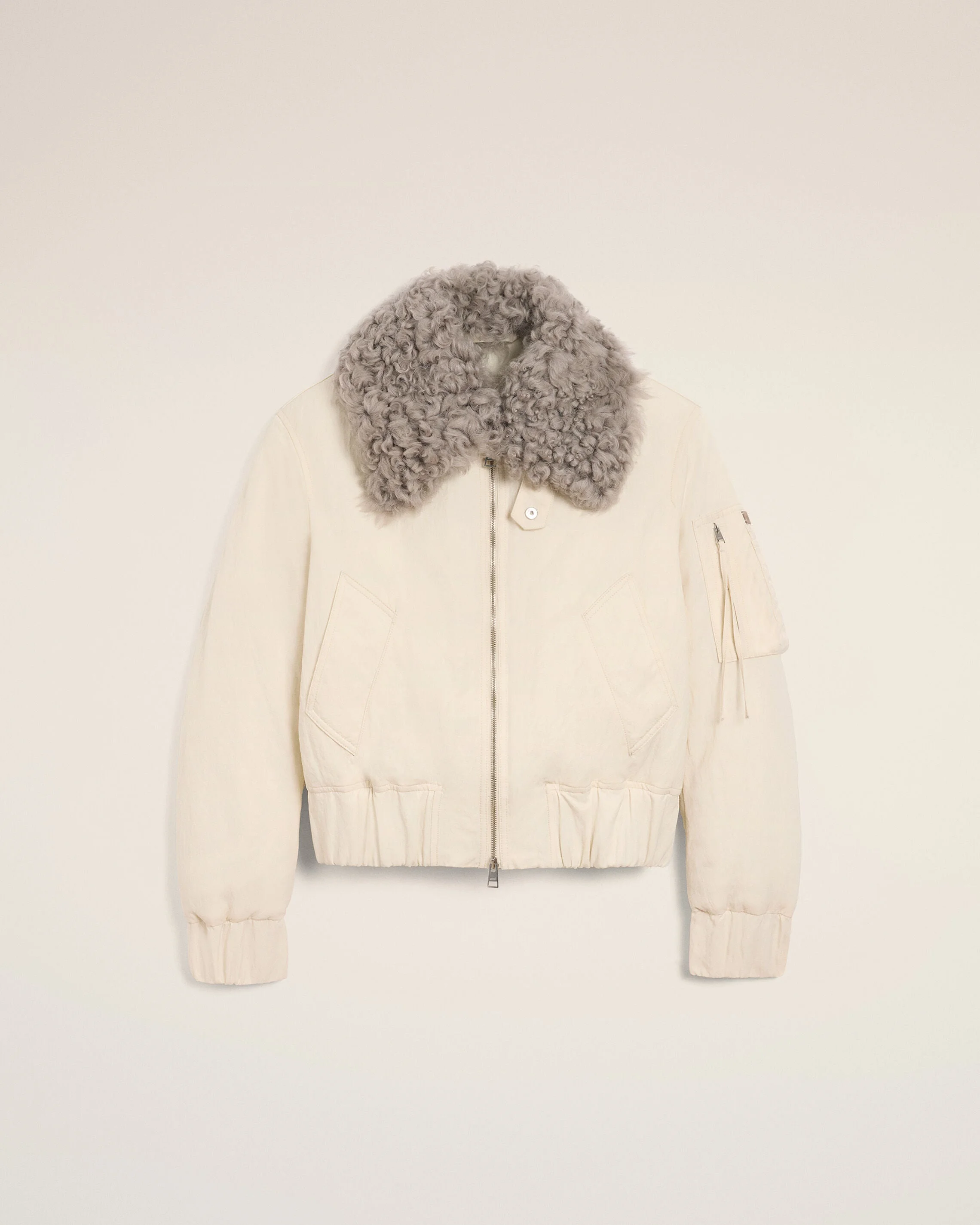 Padded bomber in crinkled nylon serge. Unisex product Removable shearling collar Nickel double metal zipper with "ami" engraved puller Zipped pocket on the sleeve Elasticated cuffs and waist Front and intern pockets with invisible snap buttons "ami alexandre mattiussi" leather label on the sleeve Fully lined and padded Water repellent fabric 57 cm center back length (size XS) 62 cm center back length (size M) Made in Romania (with love) REF: UJK821.PA0035.185 SIZE & FIT This style is unisex. For man, take your normal size. For woman, take one size down than your usual size. Man model is 183 cm / 6"0 and is wearing a size M. Woman model is 177 cm / 5"9 and is wearing a size XS. COMPOSITION & CARE GUIDE Main Material : 100% Polyamide Main Lining : 100% Polyester Collar : 100% Lamb Leather Padding : 100% Polyethylene Pocket Lining : 100% Cotton Do not wash Chlorine prohibited Do not tumble dry Cool iron Dry clean gentle