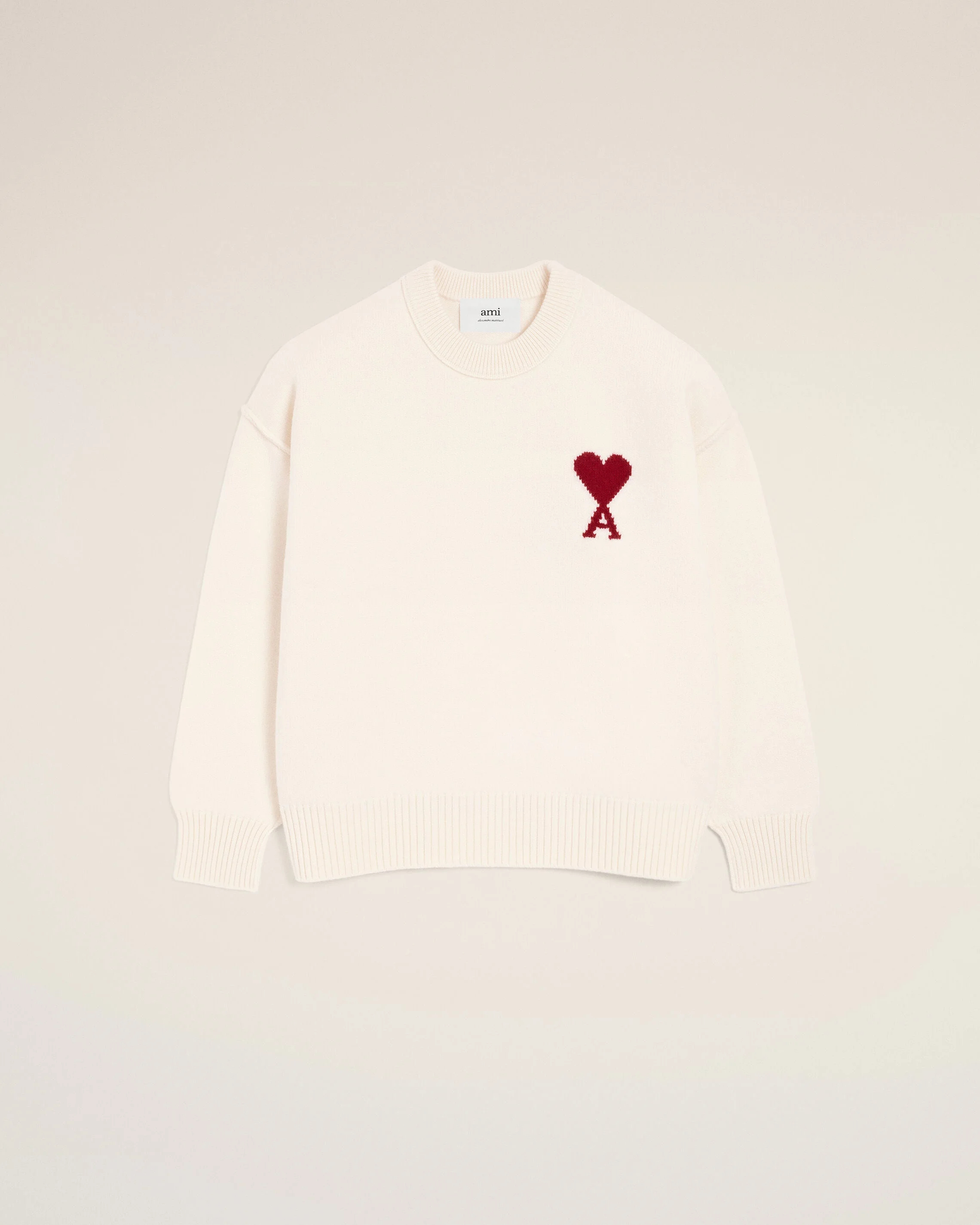 Sweater in felted merino wool knit. Unisex product Crewneck Intarsia knitted Ami de Coeur on the chest Jersey stitch Inside out seams 64 cm center back length (size M) 58 cm center back length (size XS) Made in Portugal (with love) REF: UKS838.018.154 SIZE & FIT This style is unisex. For man, take your normal size. For woman, take one size down than your usual size. Man model is 186 cm / 6"1 and is wearing a size M. Woman model is 181 cm / 5"11 and is wearing a size XS. COMPOSITION & CARE GUIDE Main Material : 100% Wool Hand wash low temperature Chlorine prohibited Do not tumble dry Dry flat Cool iron Dry clean possible