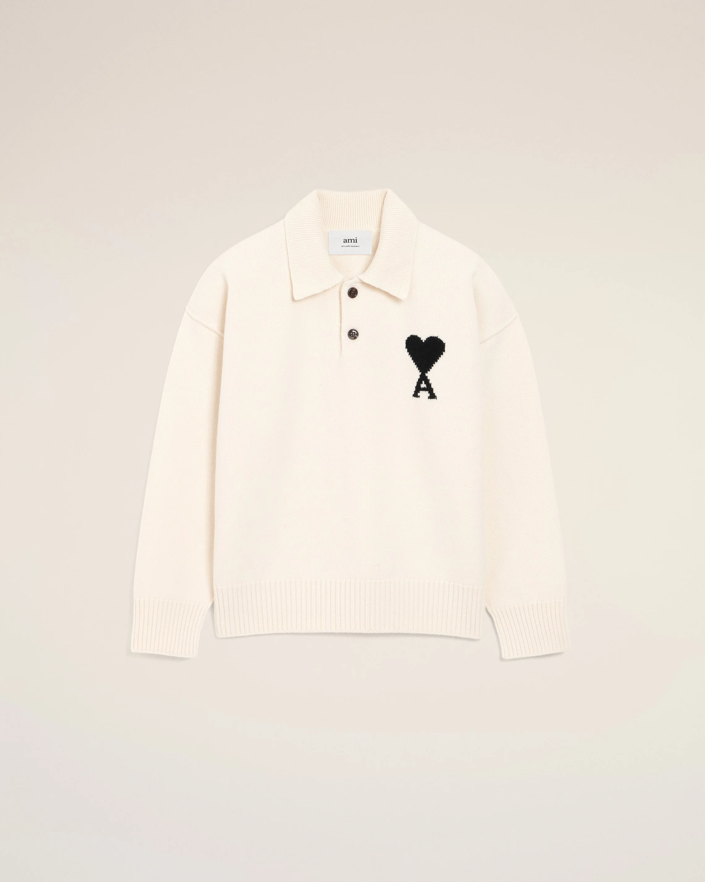 Polo in felted merino wool knit. Unisex product Manches longues "ami" engraved horn buttons Intarsia knitted Ami de Coeur on the chest Inside out seams Jersey stitch 65 cm center back length (size M) 61 cm center back length (size XS) Made in Portugal (with love) REF: UPL409.018.151 SIZE & FIT This style is unisex. For man, take your normal size. For woman, take one size down than your usual size. Man model is 183 cm / 6"0 and is wearing a size M. Woman model is 177 cm / 5"9 and is wearing a size XS. COMPOSITION & CARE GUIDE Main Material : 100% Wool Hand wash low temperature Chlorine prohibited Do not tumble dry Dry flat Cool iron Dry clean possible Contains non-textile parts of animal origin