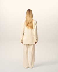 Double breasted jacket in wool flannel. Oversized fit Notch collar Horn buttons 6 buttons double breasted 2 double piped pockets 1 chest piped pocket 3 inside pockets Buttoned cuffs 2 back slits Fully lined AMF stitches on the collar, lapel and flap pockets "Ami Alexandre Mattiussi" woven label at the bottom left sleeve 77 cm center back length (size 36) Made in Romania (with love) REF: FBV002.WV0058.185 SIZE & FIT This item is designed to be worn lose. Take your normal size. Model is 177 cm / 5"9 and is wearing a size 36. COMPOSITION & CARE GUIDE Main Material : 100% New Wool Main Material : 100% New Wool Body Lining : 50% Polyester 50% Cotton Sleeves Lining : 54% Acetate 45% Viscose 1% Polyester Pocket Lining : 65% Polyester 35% Cotton Do not wash Chlorine prohibited Do not tumble dry Cool iron Dry clean gentle