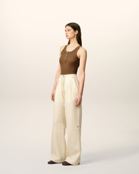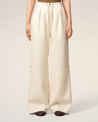 Zipped trousers in wool gabardine. Wide fit Visible zipped fly Pockets with invisible snap buttons "ami alexandre mattiussi" leather label on the back Drawstrings at the belt Details with metal eyelets and studs 33 cm bottom leg width (size S) Made in Portugal (with love) REF: FTR834.WV0088.185 SIZE & FIT This item is designed to be worn lose. Take your normal size. Model is 181 cm / 5"11 and is wearing a size S. COMPOSITION & CARE GUIDE Main Material : 100% New Wool Pocket Lining : 65% Polyester 35% Cotton Do not wash Chlorine prohibited Do not tumble dry Medium iron Dry clean possible Contains non-textile parts of animal origin