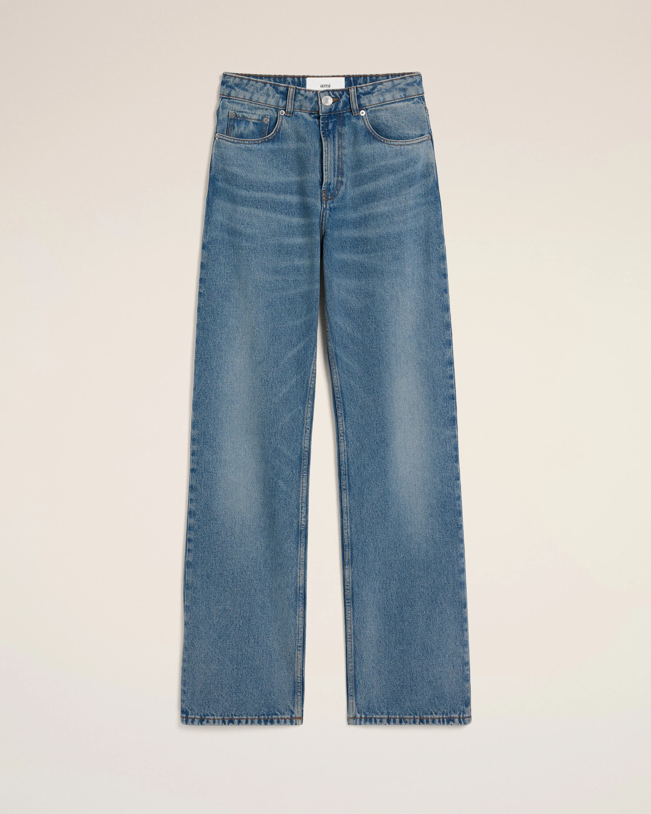 Large fit jeans in used indigo denim. Large fit 25 cm bottom leg width (size 26) Classic waist Large leg 5 pockets Zipped fly Denim metal rivets and buttons in nickel color "ami alexandre mattiussi" patch on the back Tobacco topstitches Made in Portugal (with love) REF: FTR450.DE0046.480 SIZE & FIT Fits true to size. Take your normal size. Model is 1m79 / 5'10" and is wearing a size 26. COMPOSITION & CARE GUIDE 100% Cotton Machine wash at 30°C Chlorine prohibited Do not tumble dry Medium iron Dry clean possible