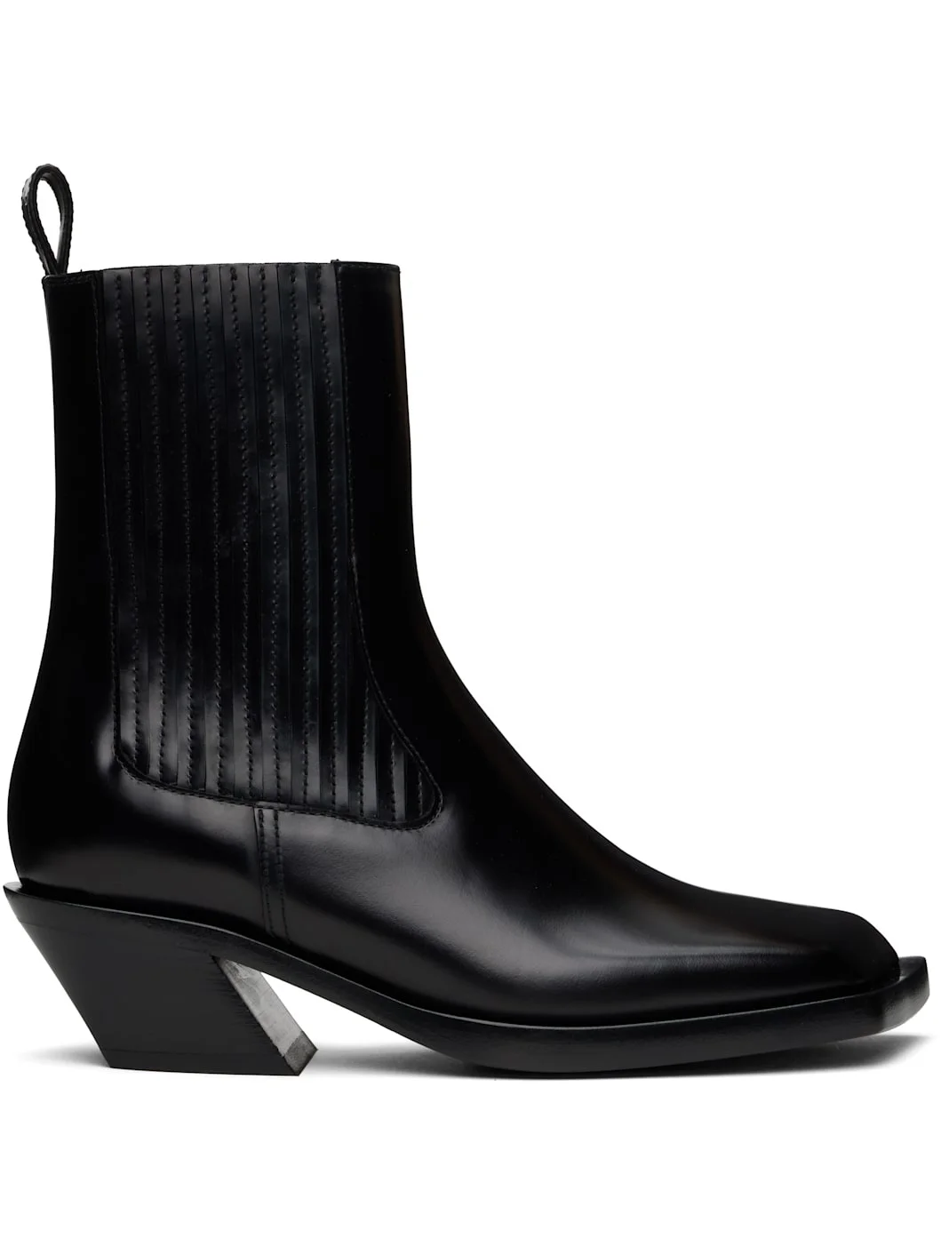 Ankle-high polished calfskin Chelsea boots in black. · Square toe · Elasticized gusset at sides · Pull-loop at heel collar · Buffed calfskin lining · Stacked leather heel with rubber injection · Leather sole with rubber injection · Heel: H2" Supplier color: Black Upper: calfskin. Sole: leather, rubber. Made in Italy 242415F113002