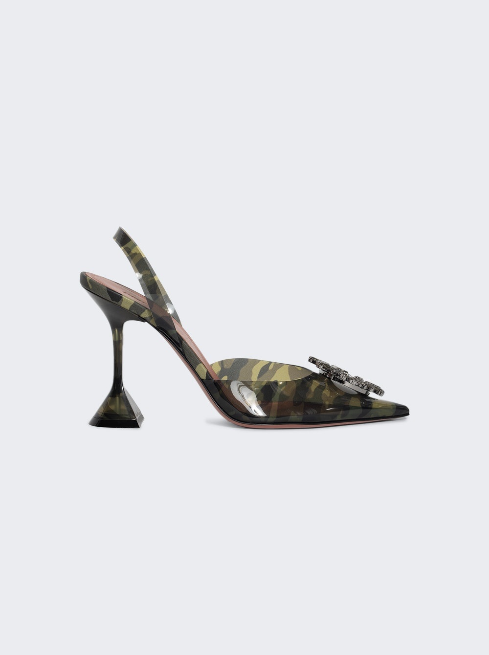 Details - Transparent camouflage print - Slingback strap - 95mm high sculpted heel - Glass crystal embellishment - Pointed toe - Leather and rubber sole - Outer: 100% Polyurethane - Listed in IT sizing, fits true to size Brand Style: BEGUM GLASS SLING 95MM Designer/Brand: AMINA MUADDI