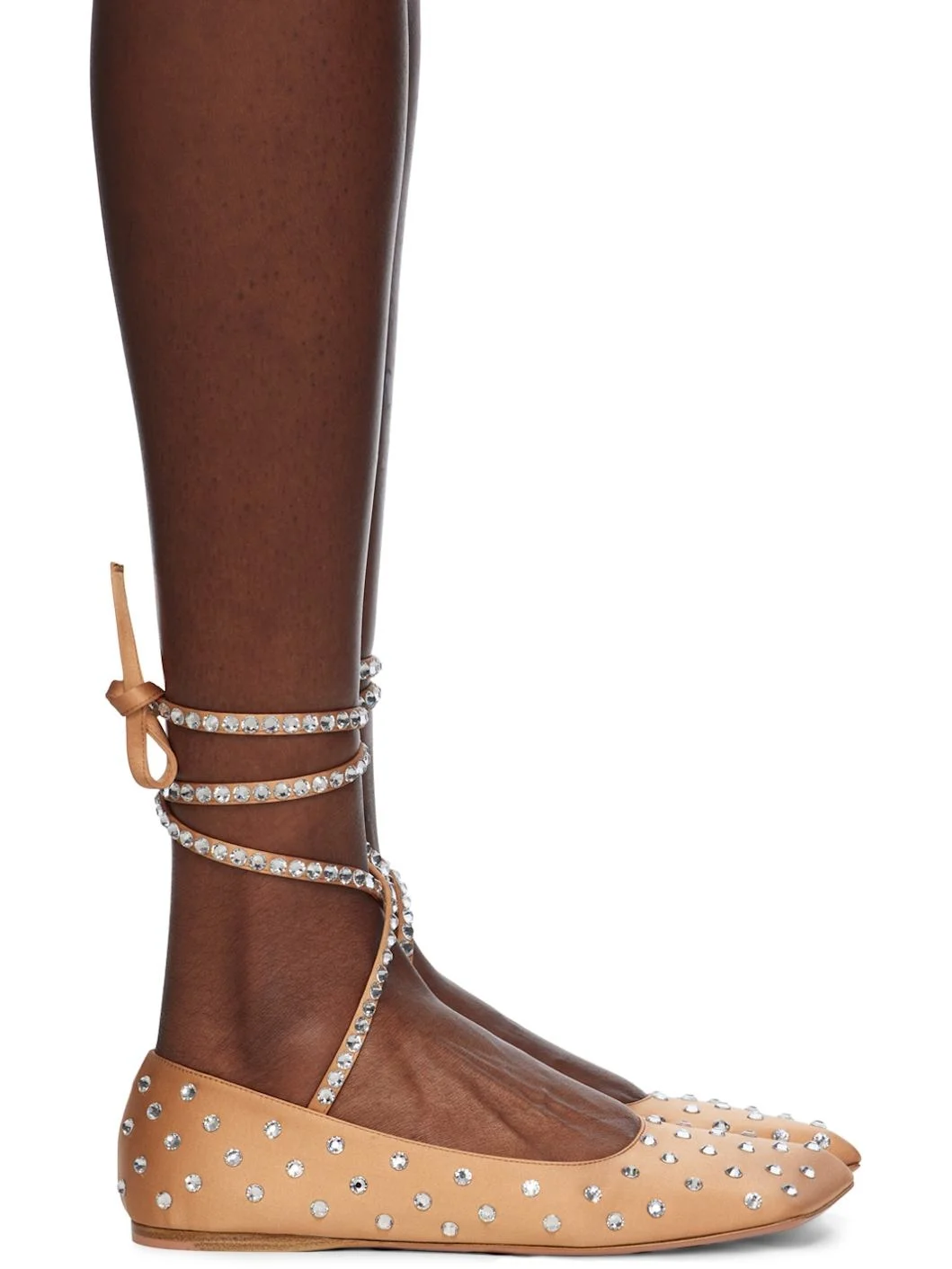 Silk satin ballerina flats in beige. · Crystal-cut accents throughout · Asymmetric square toe · Wraparound lace-up ankle strap · Logo embossed goatskin footbed · Polished leather sole with rubber injections Supplier color: Latte Upper: silk, goatskin. Sole: leather, rubber. Made in Italy 242415F118001