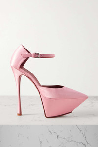 EDITORS'NOTES Amina Muaddi's 'Angelica Plateau' pumps have a unique, angular shape that makes a real statement. Designed with sleek pointed toes, this satin pair is set on towering 150mm heels balanced by sturdy platforms. Adjust the slim strap for your ideal support. SIZE & FIT - Fits true to size, take your normal size - Italian sizing DETAILS & CARE - Heel measures approximately 150mm/ 6 inches with a 55mm/ 2 inch platform - Pink satin - Buckle-fastening ankle strap