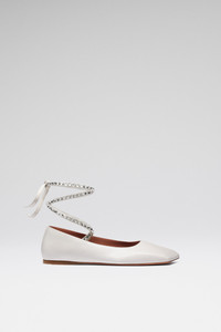Ane Lace Up Flat White Nappa - Ballet flat with crystal-embellished straps - Squared oblique toe - Fits true to size Composition - Upper: 100% LAMBSKIN - Lining: 100% Goat - Sole: 70% Leather and 30% Rubber Origin Made in Italy