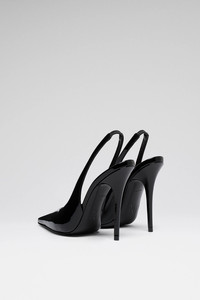 Anok Sling 105 Black Patent - 105mm Stiletto Heel - Pointed toe - Fits true to size Composition - Upper: 100% Laminated Calfskin - Lining: 100% Kid Lining - Sole: 90% Calfskin 10% TPU Origin Made in Italy