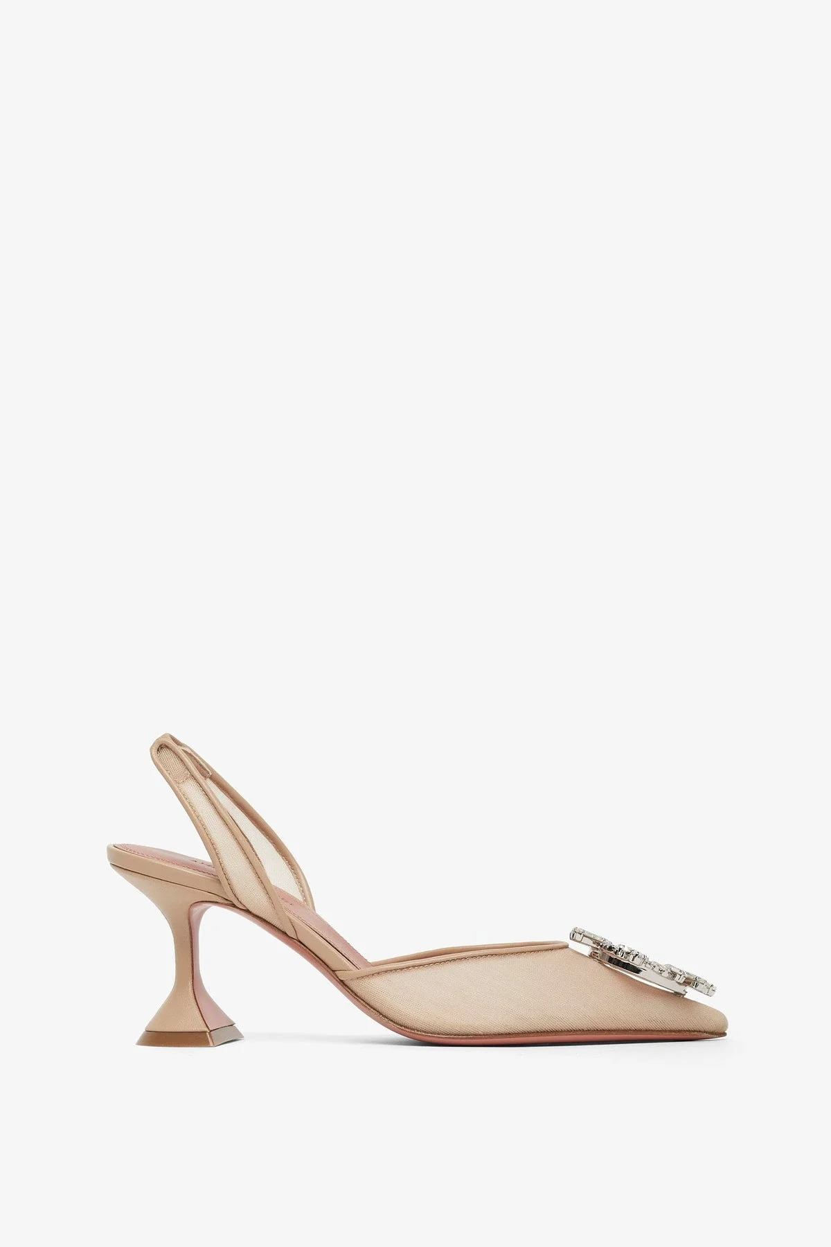 Beige mesh slingback pumps from Amina Muaddi. The Begum slingback pumps is the designer's signature style. It is made from beige mesh mounted on a 70mm sculptural "Martini" heel, an elegantly pointed toe complete with a crystal-embellished buckle at the front. - Leather sole - True to size - Made in Italy Product Code: 13S361091BEG
