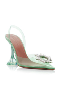Well-crafted and unambiguously glamorous, Amina Muaddi's accessories are in high demand by international tastemakers. The brand is synonymous with vibrant hues, luxurious embellishments, and metallic shine all while being exquisitely designed to last well after the party. Loved by Rosie Huntington-Whiteley, Kendall Jenner and Rihanna (just to name a few), the 'Begum' slingback pumps are made from transparent PVC topped with a crystal brooch at the pointed toes. Show off the signature fluted heel with mini dresses. PRODUCT DETAILS - Heel measures approximately 95mm/ 3.75" - Slip on - Composition: PVC - Designer color: Mint - Made in Italy