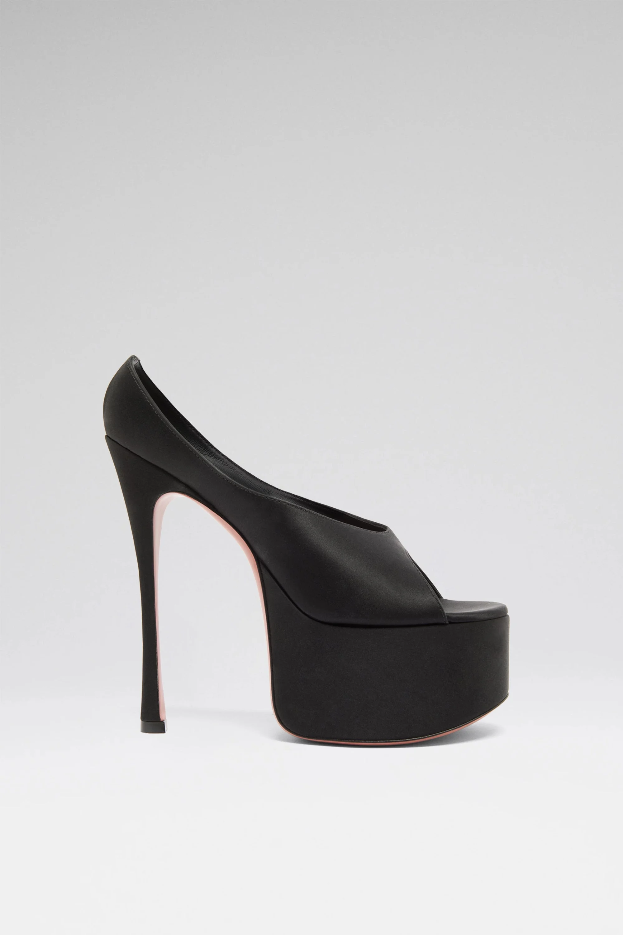 Anok Plateau Slipper 155 Black Satin - 155mm Heel 60mm Plateau - Open rounded toe Composition - Upper: 100% Satin - Lining: 80% Kid Lining and 20% Satin - Sole: 90% Calfskin and 10% TPU Origin Made in Italy