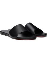 Grained nappa lambskin slip-on sandals in black. · Open square toe · Strap at vamp · Logo embossed at footbed · Stacked leather midsole · Leather sole with rubber injection Supplier color: Nappa black Upper: lambskin. Sole: leather, rubber. Made in Italy 252415F124001